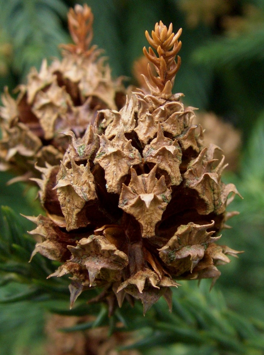 Reife Zapfen aufrecht, eiförmig, verholzend, mit Dornen auf den Schuppen