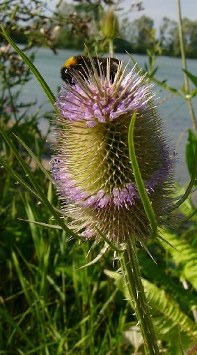 Köpfchen eiförmig, stachlig Blüten hellviolett > Karde (Dipsacus)