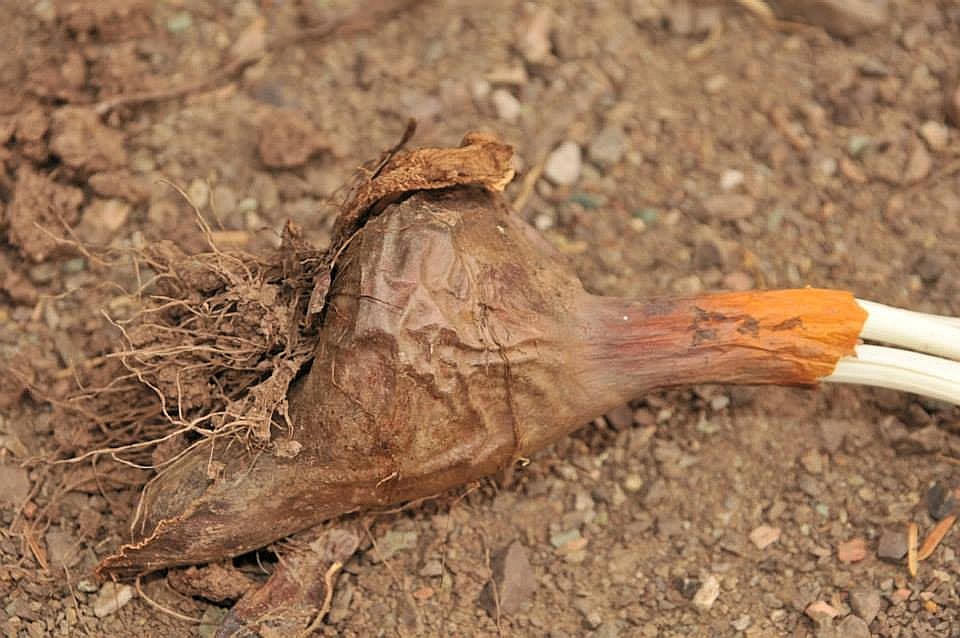 Zwiebel eiförmig, 30 - 50 mm lang, 25 - 45 mm breit, Zwiebel mit mehreren ledrigen, braunen oder rotbraunen Hüllen, mit 4 - 13 cm langem Nacken