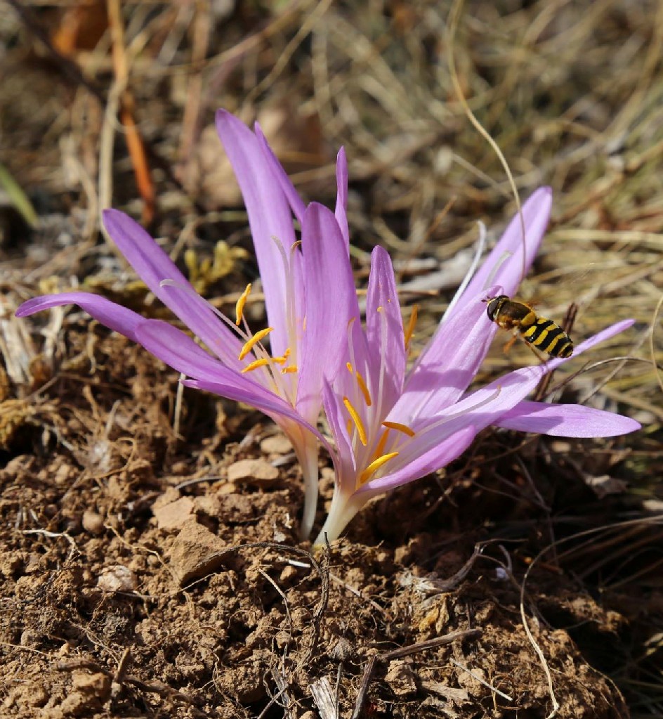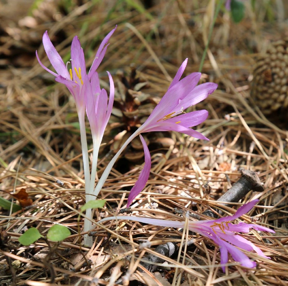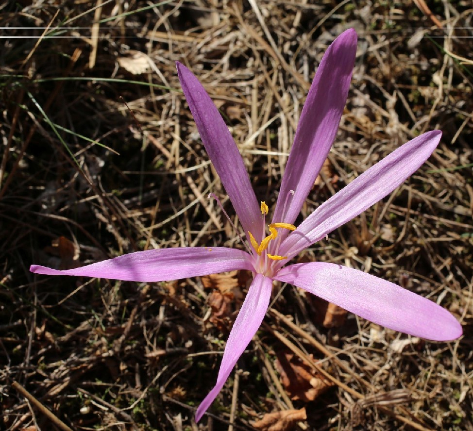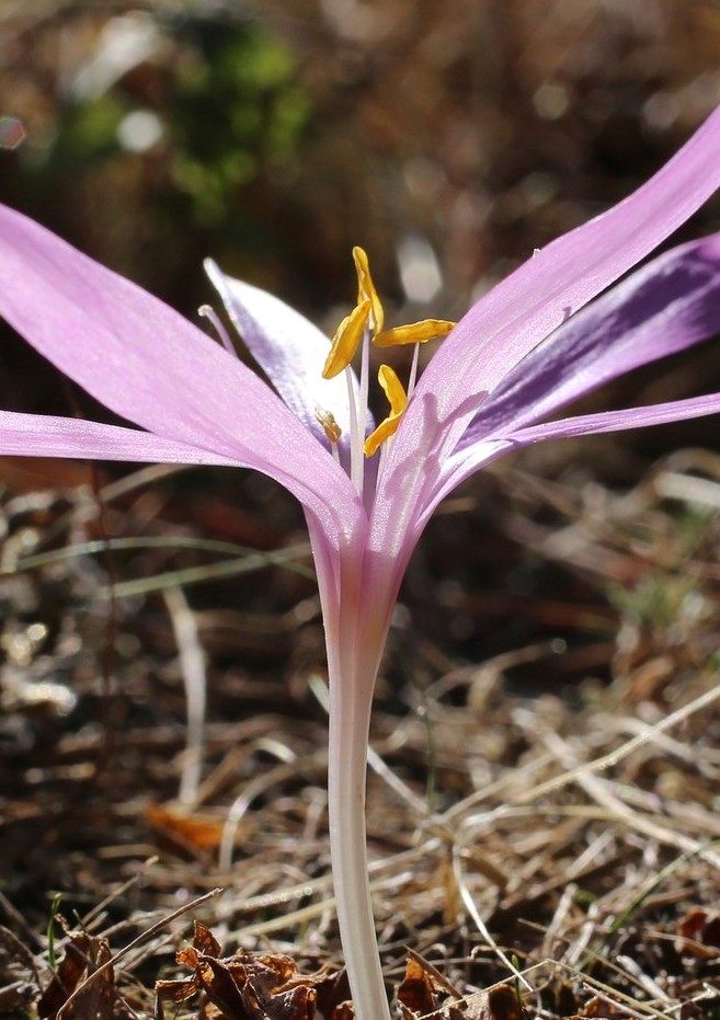 krokusähnlichen hellvioletten Blüten, zur Blütezeit ohne Blätter;