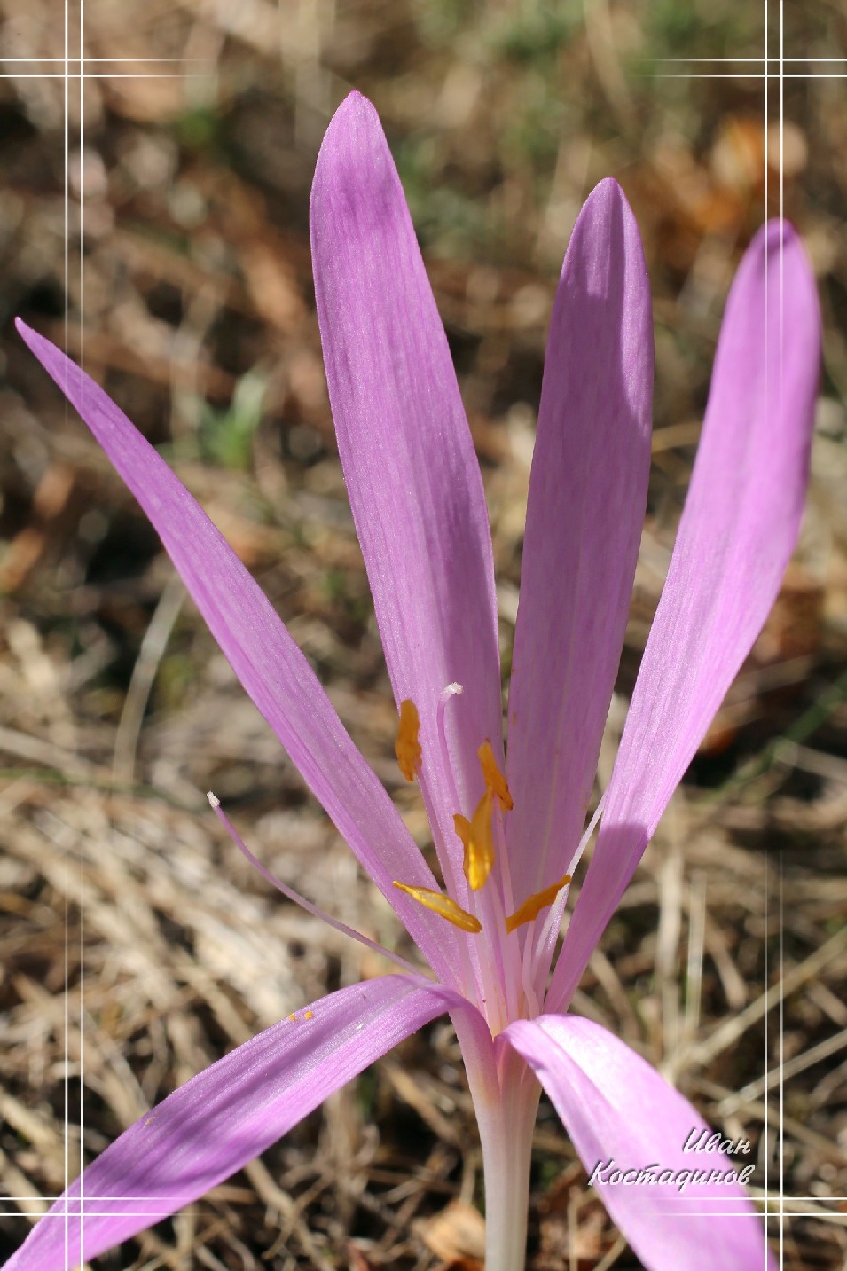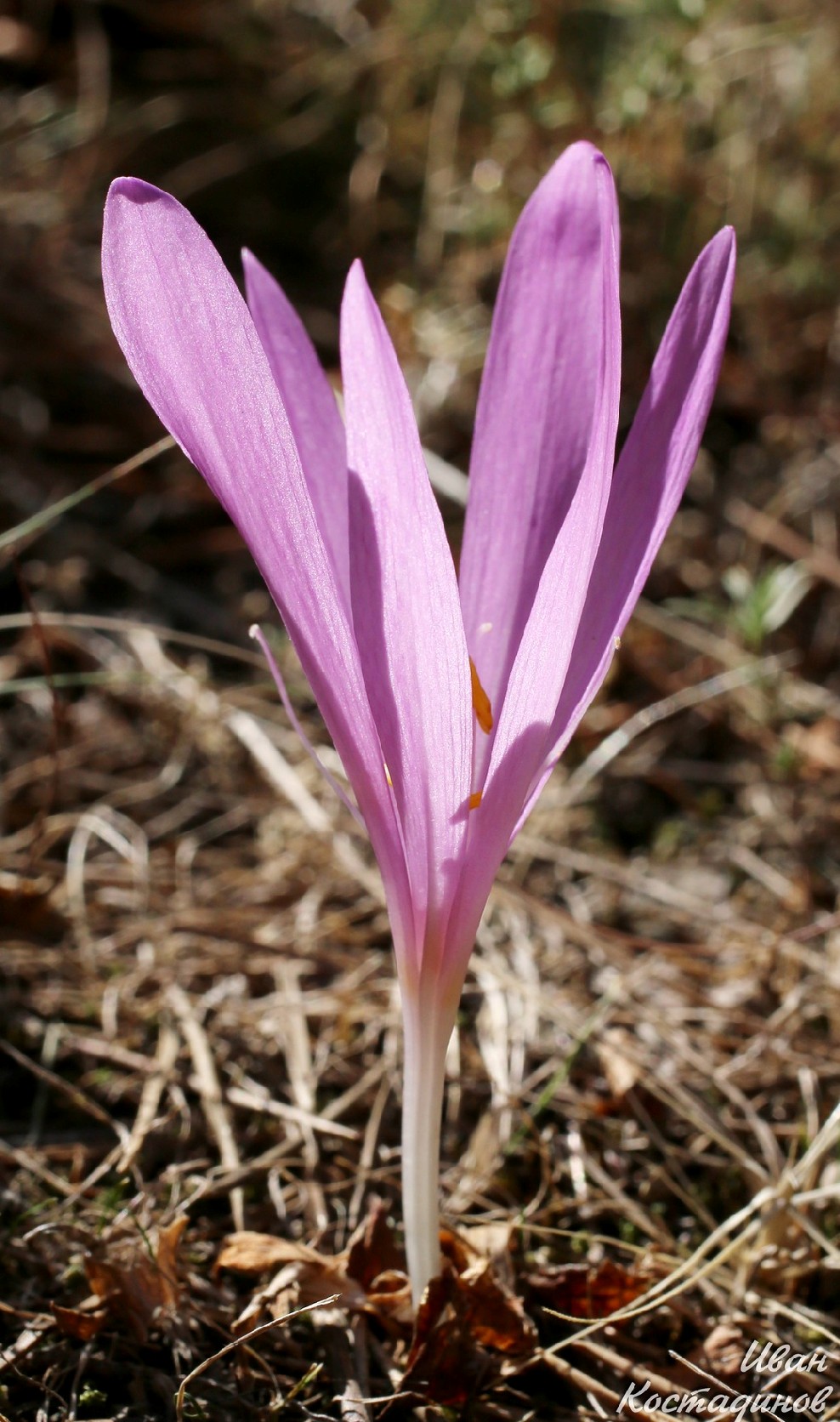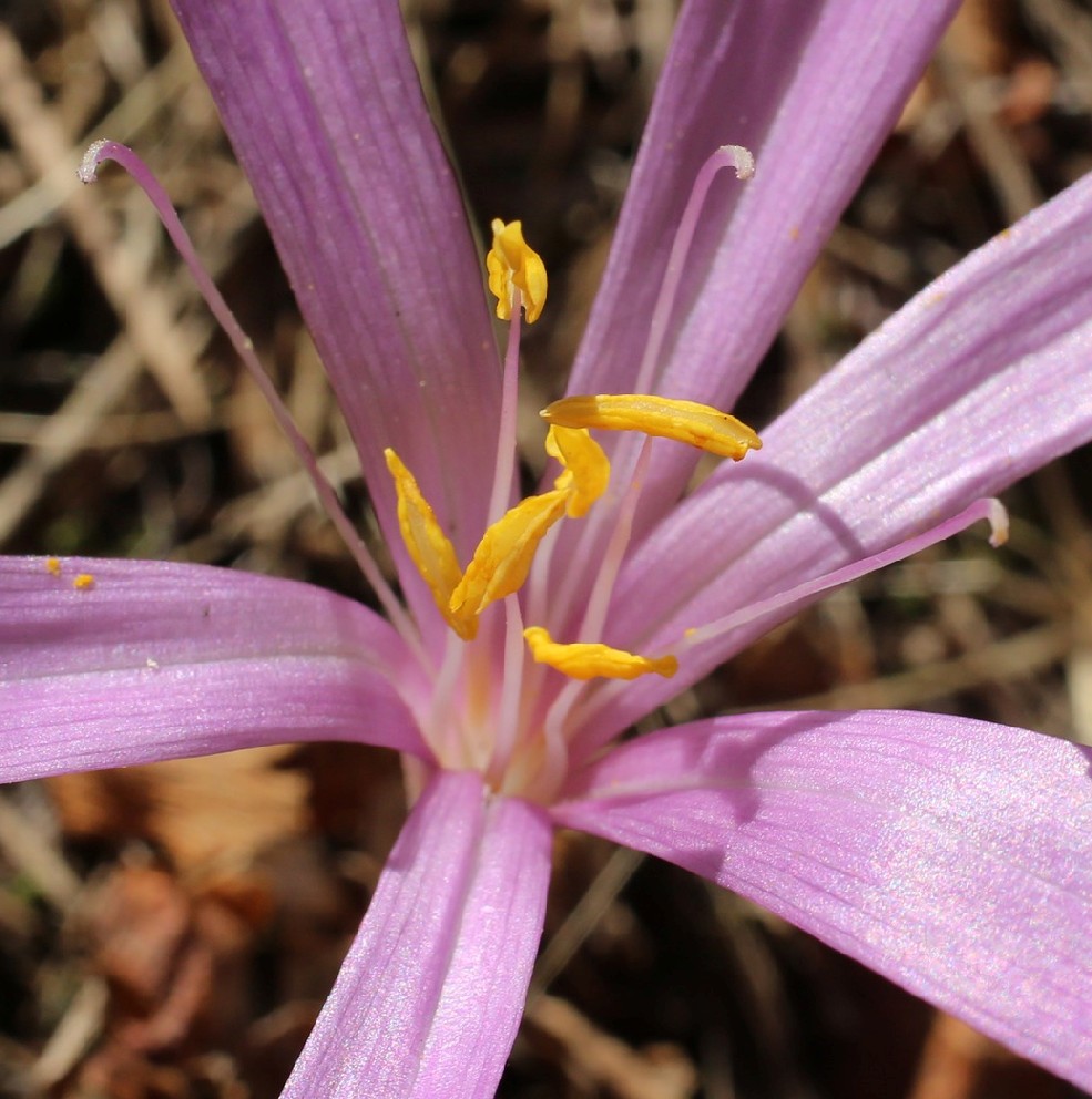 krokusähnlichen hellvioletten Blüten, zur Blütezeit ohne Blätter;