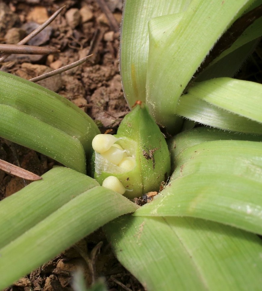 Staubblätter 10 - 22 mm lang, Antheren 3 - 6 mm lang, gelb, Filamente weiß, am Grund etwas geschwollen, gelb, Griffel vorne gekrümmt, so lang oder etwas länger als die Antheren, Narben herablaufend Kapsel eiförmig, 30 - 60 mm lang, auf Bodenhöhe, reift im Frühsommer Samen eikugelig, 2 - 3 mm im Durchmesser, reif rotbraun Blätter zu 3 - 5, +/- abstehend, lanzettlich, 120 - 200 mm lang, 30 - 48 mm breit, +/- sichelförmig, aufrecht, vorne stumpf, manchmal mit Kapuzenspitze, gekielt, kahl, schraubig verdreht, am Rand knorpelig