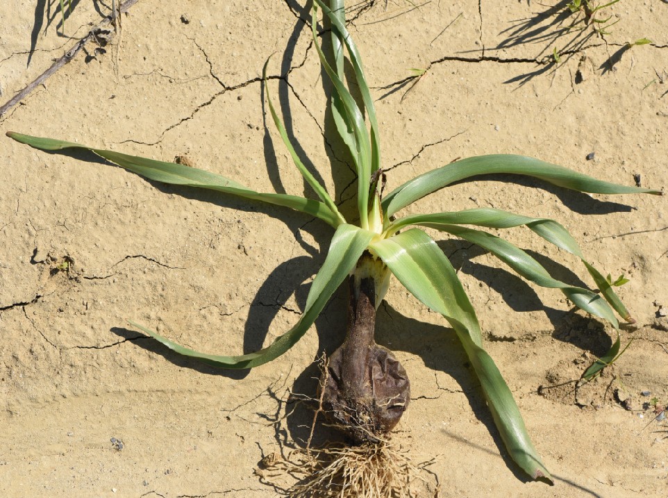 Zwiebel 3 - 5 cm lang, 2 - 4 cm breit, von schwarzbraunen, +/- dicken, ledrigen Hüllen umgeben, in einen 3 - 8 cm langen Nacken auslaufend