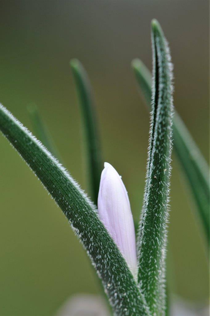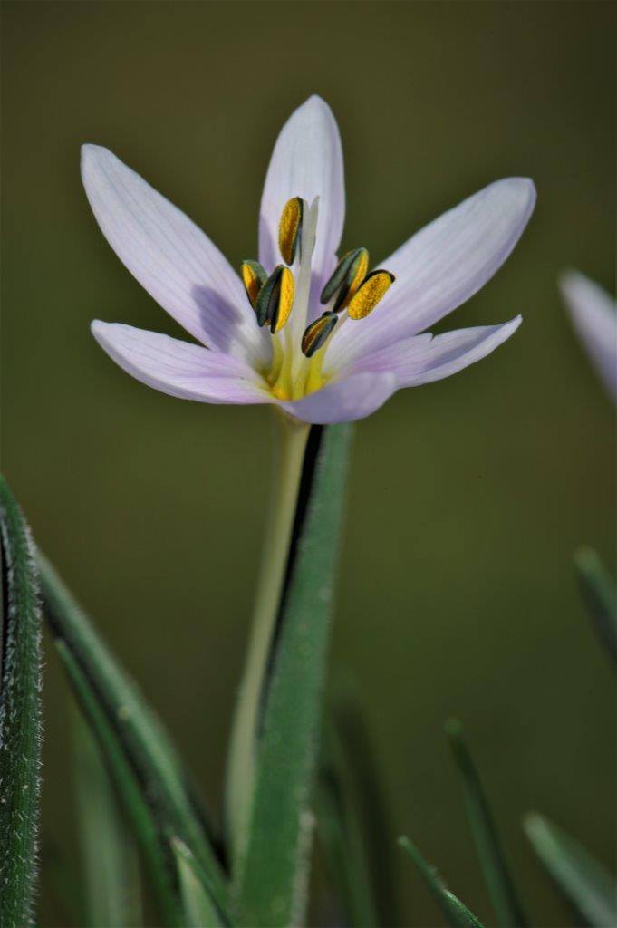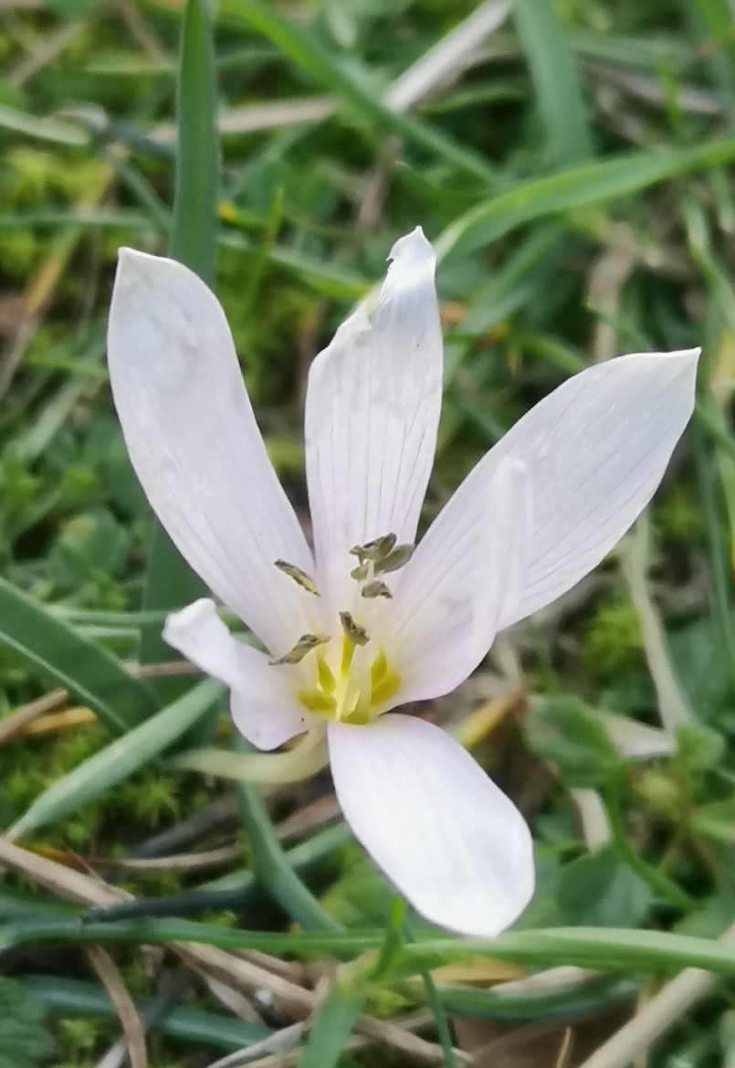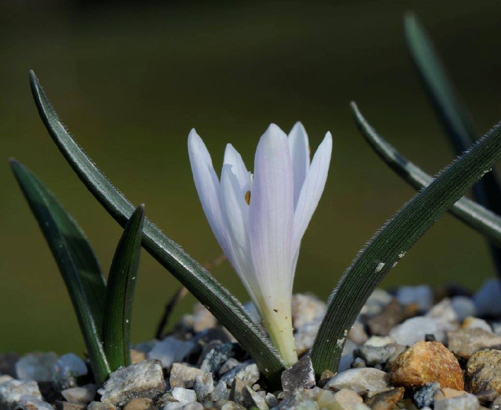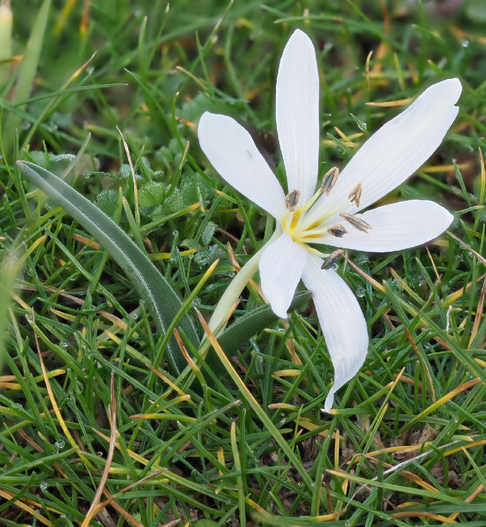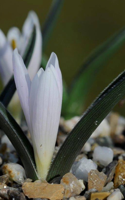 Blühende Pflanze 6 - 12 cm hoch, Blüten zu 3 - 6, weiß oder hell rosaviolett, mit 6 Perigonblättern, die im unteren Teil zu einer langen Perigonröhre verwachsen sind