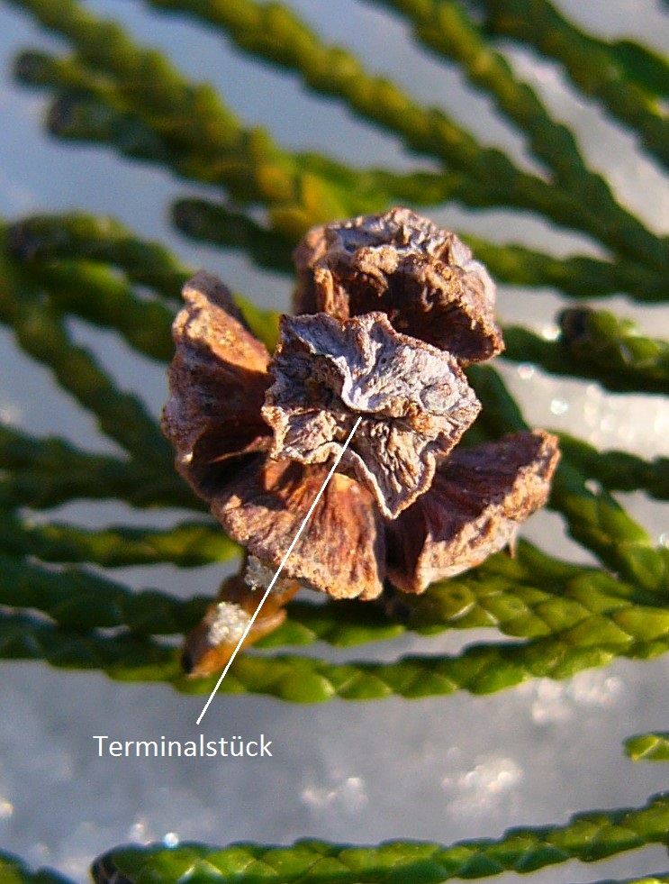 Cupressaceae - Blätter schuppenförmig, Zapfen kugelig, aus 6 - 16 Schuppen, verholzend