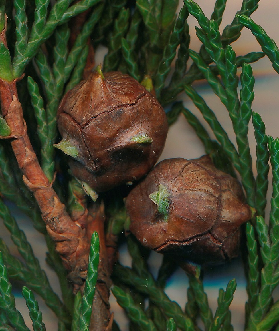 Weibliche Zapfen kugelig, oft gelblich, mit Höcker,