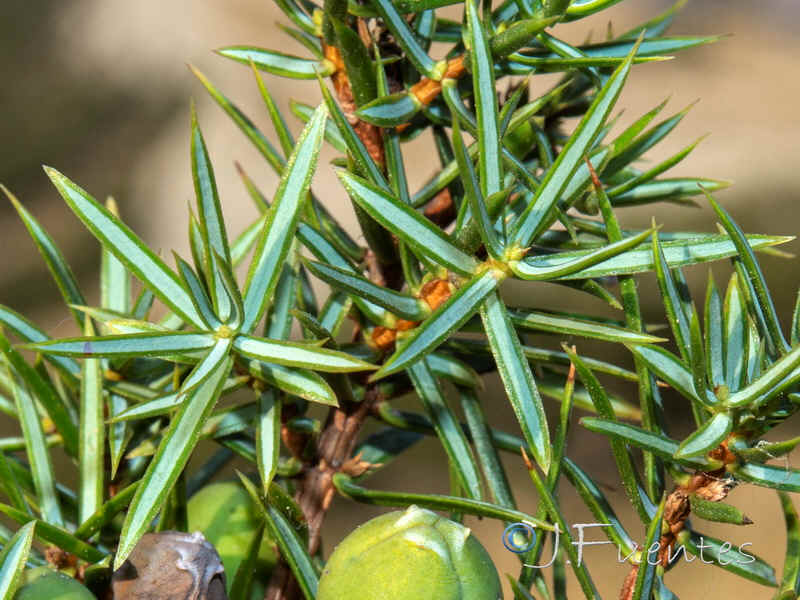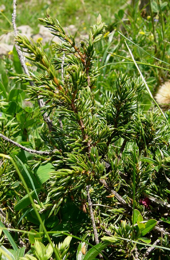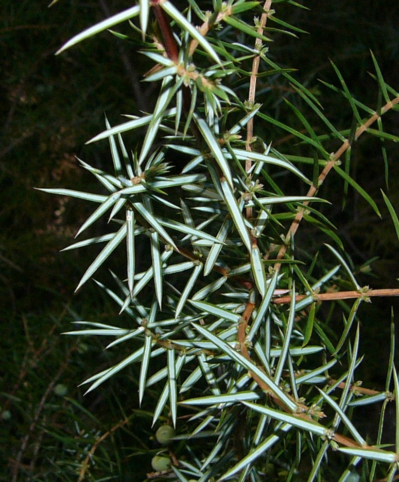 Zapfen beerenartig, aromatisch, von den zugehörigen Nadeln wenig überragt