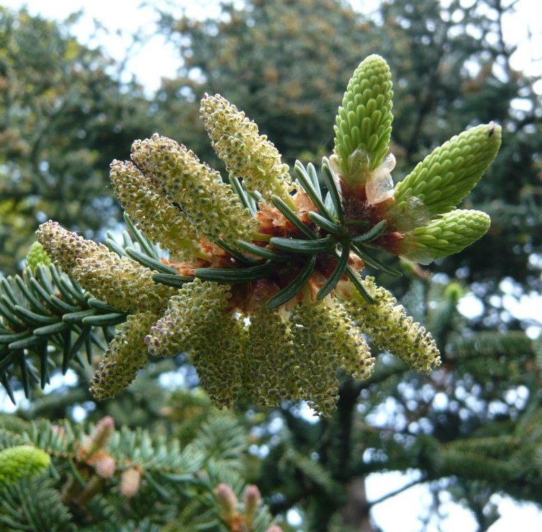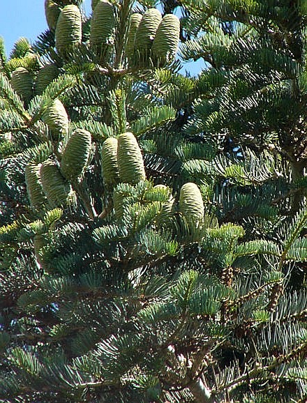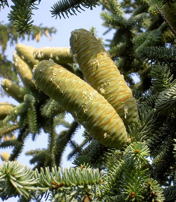 Weibliche Zapfen 10 bis 15 cm lang, 4 - 5 cm dick, jung grün, mit rötlichem oder violettem Reif