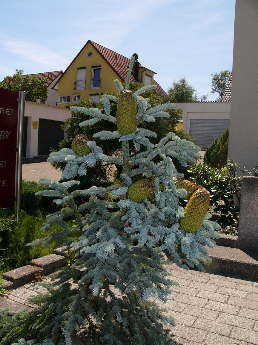 Zapfen gehäuft an der Baumspitze, 8-14 cm lang, erst blaugrün, später trüb-violett, bleiben am Baum und fallen nicht herunter, Fruchtreife: VIII - IX