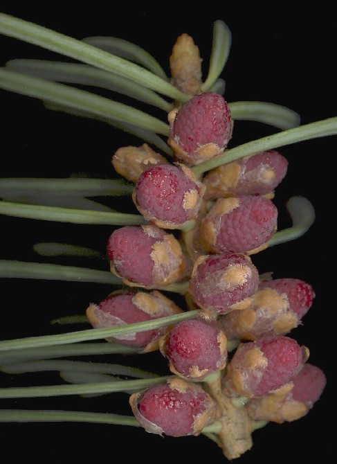 Männliche Blütenzapfen erst grün, dann purpurrot,