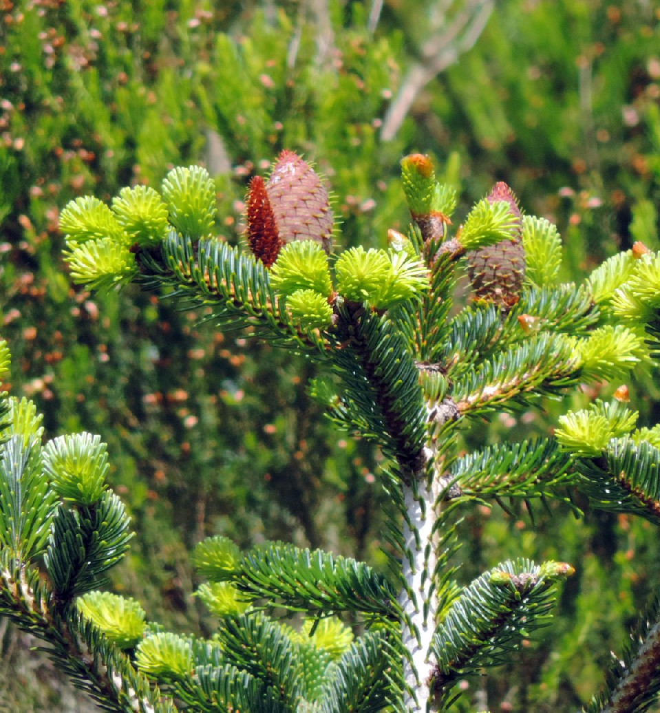 1 Triebe olivgrün bis rötlich, Knospen harzig, Nadeln 3 - 6 cm lang