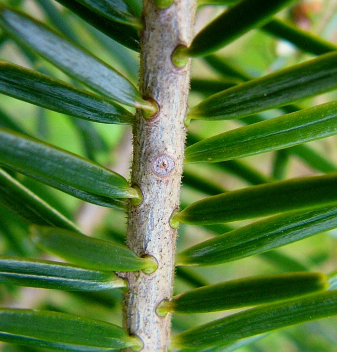Nadeln dunkelgrün, oberseits deutlich gescheitelt