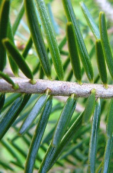 aufrecht, auf dem Baum zerfallend Nadeln mit scheibenförmiger Ansatzstelle ohne herablaufendes Stielchen > Abies (Tanne)