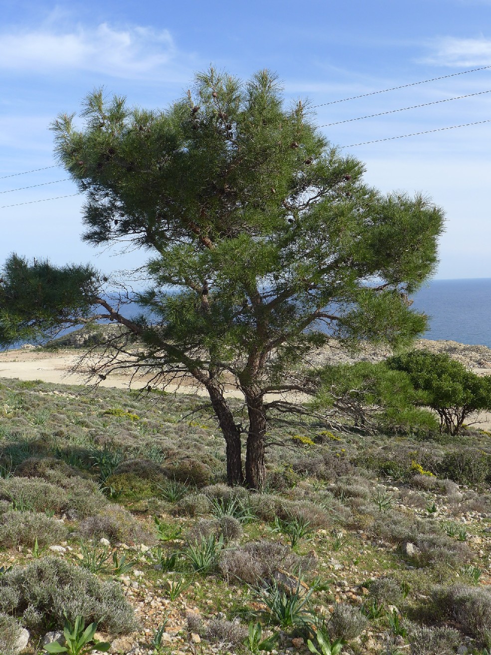 in: Etymologie: Die Aleppo- Kiefer ist im Mittelmeerraum weit verbreitet und wächst sowohl in Strandnähe als auch in höheren Lagen (Peloponnes bis 1.000 Meter, Chalkidiki bis 650 m). Die bei Kiefern z.B. Pinus halepensis auftretenden "Hexenbesen" (= kugelige und buschige Verwachsungen in Baumkronen) werden durch Knospenmutationen verursacht, die zur Bildung zahlreicher dünner und kurzer Zweige führt.