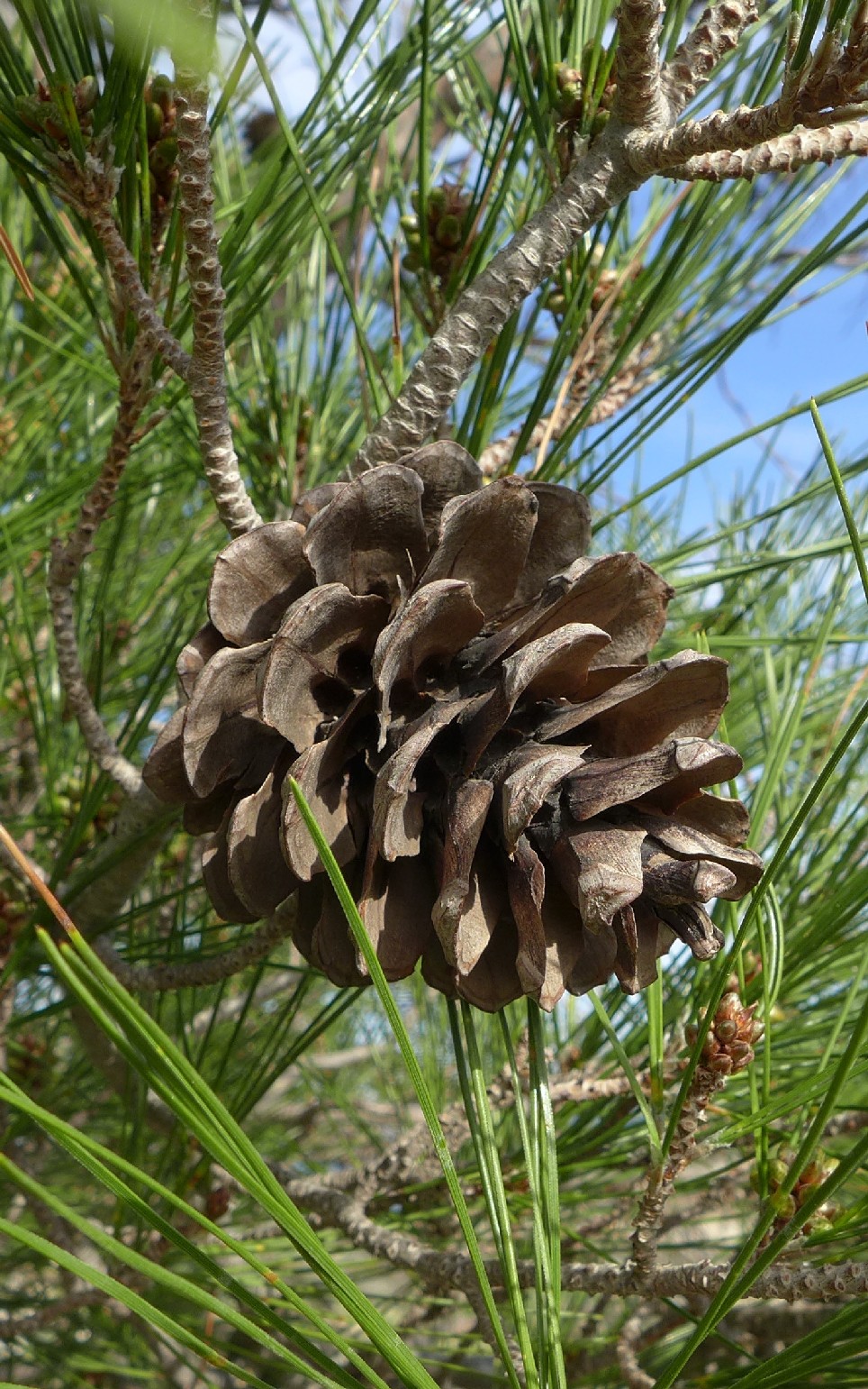 Knospen 0,5 - 1,5 cm lang, harzlos, zylindrisch, Schuppen an der Spitze lockig eingerollt Nadeln hellgrün, 11 - 16 cm lang, zu 2, gerade