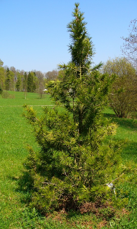 10 - 15 m hoher Baum, schmal kegelfömige Krone mit kurzen, dünnen Ästen. Im unteren Bereich herabhängend
