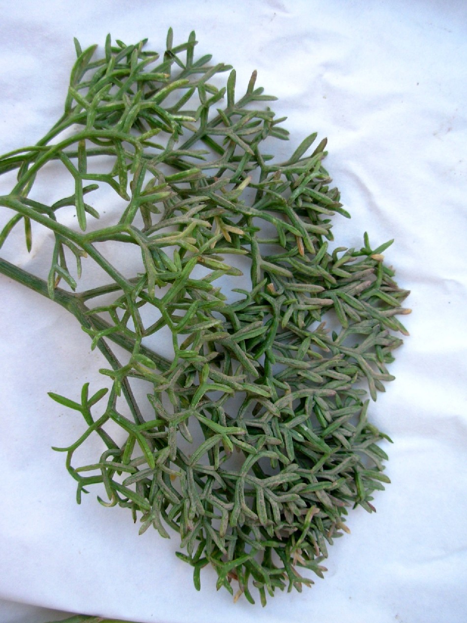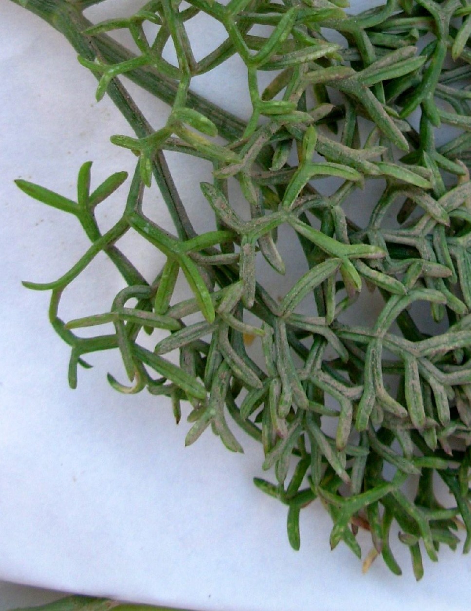 Blättchen sitzend, 3- spitzig, mit linealischen, verdickten, steifen 1 - 20 mm langen, 0,5 - 2 mm breiten Fiederabschnitten