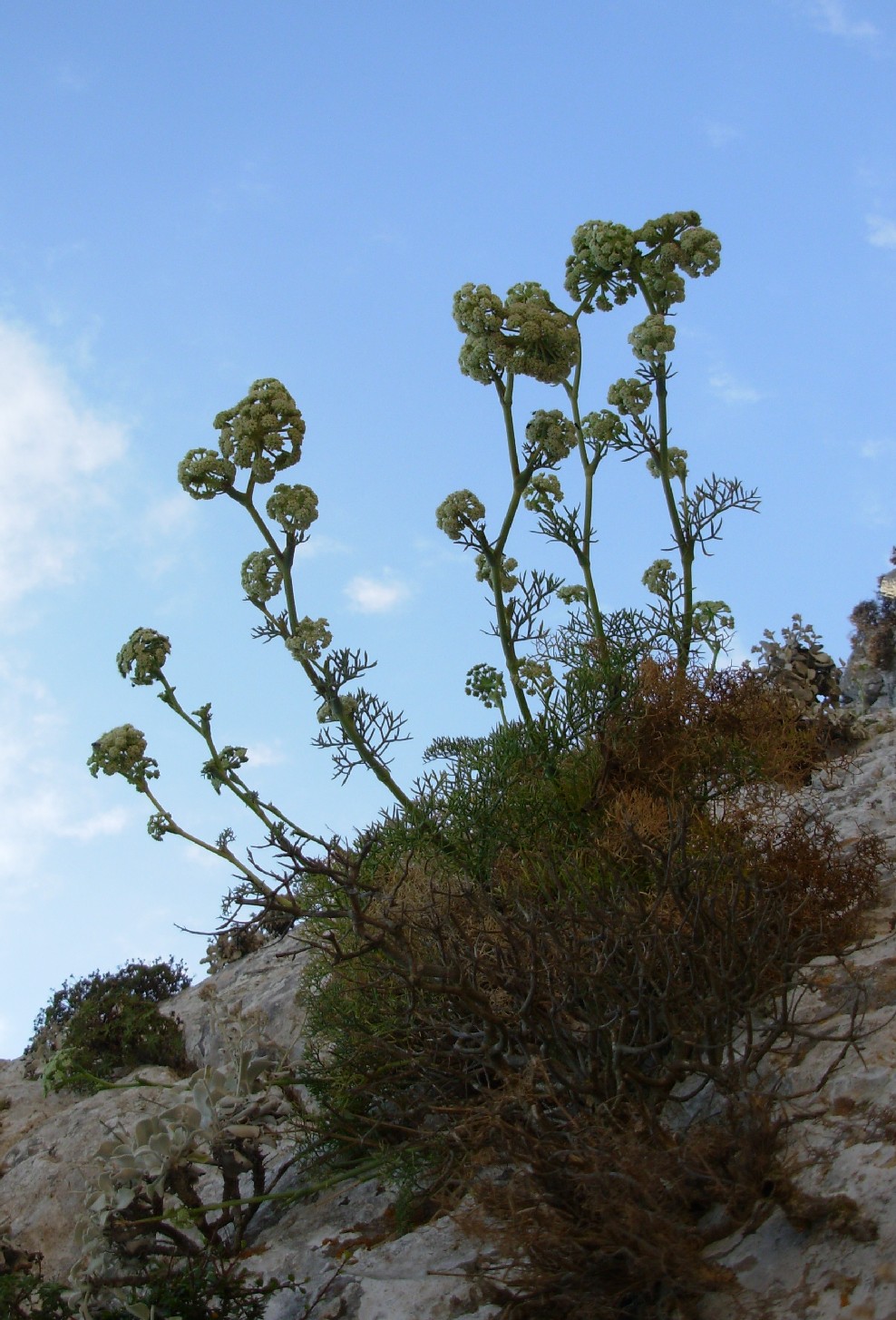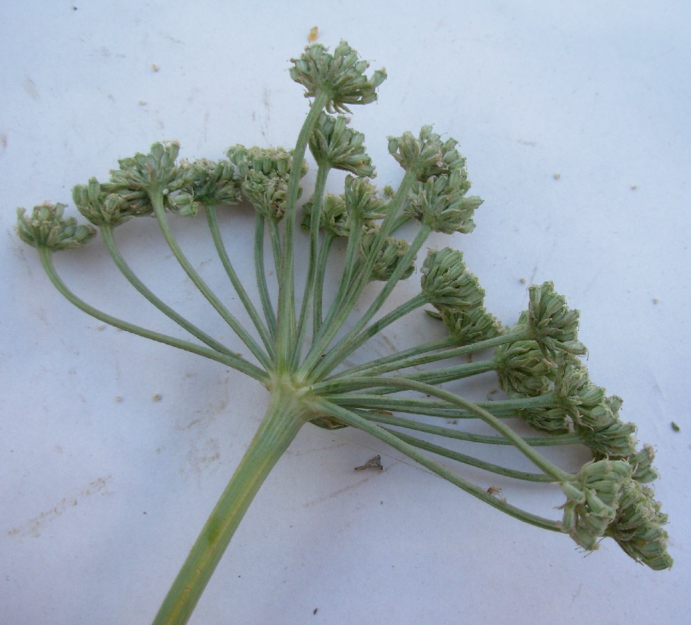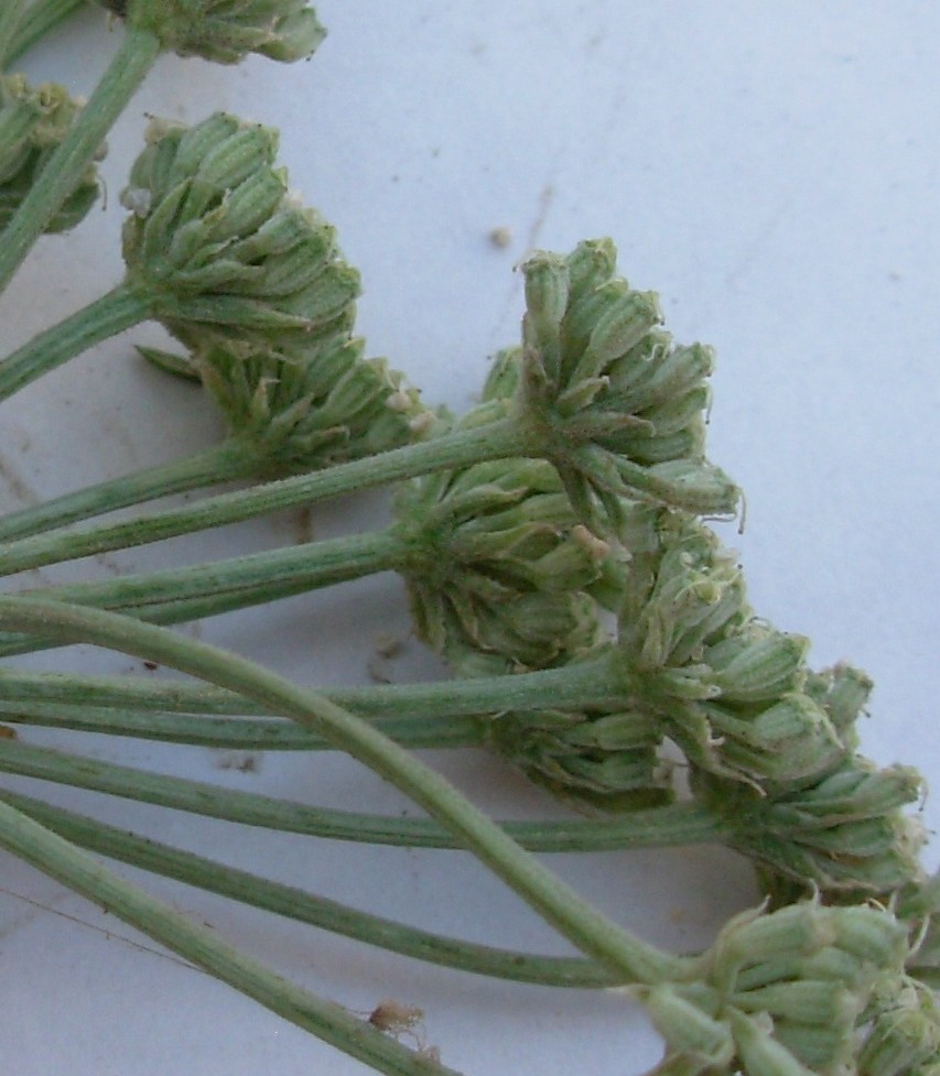 Dolden 5 - 7 cm im Durchmesser, 20 - 30- strahlig, Doldenstrahlen ungleich, bis 40 mm lang, behaart, mit 0 - 3 Hüllblättern