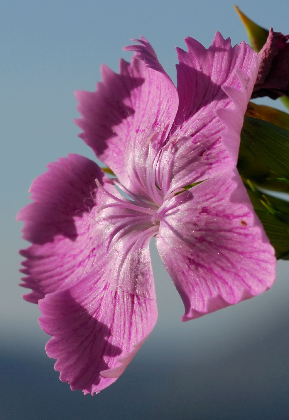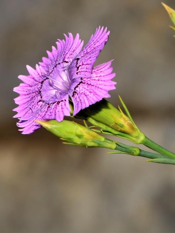 Kronblätter purpurrosa, mit dunkleren Streifen, Kronblattplatte 8 - 14 mm lang