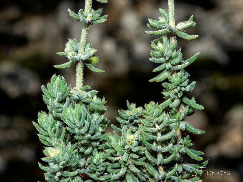 Blätter linealisch, 7 - 13 mm lang, 0,7 - 1 mm breit, mit Stachelspitzchen, am Rand umgerollt, oberseits gleichmäßig warzig- rau, unterseits dicht weißfilzig behaart