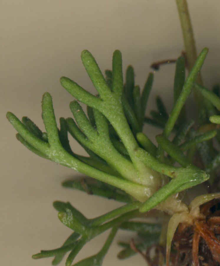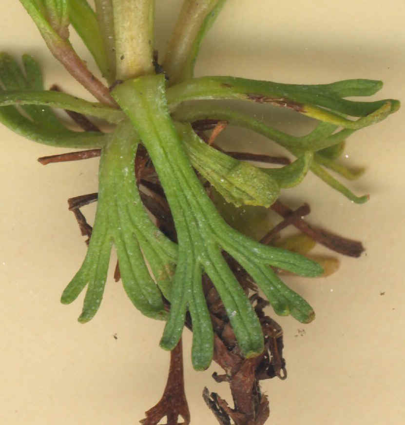 Mittlerer Lappen der Grundblätter 5 - 7 mm lang, 0,3 - 0,7 mm breit, linealisch, Blattstiel 1 mm breit