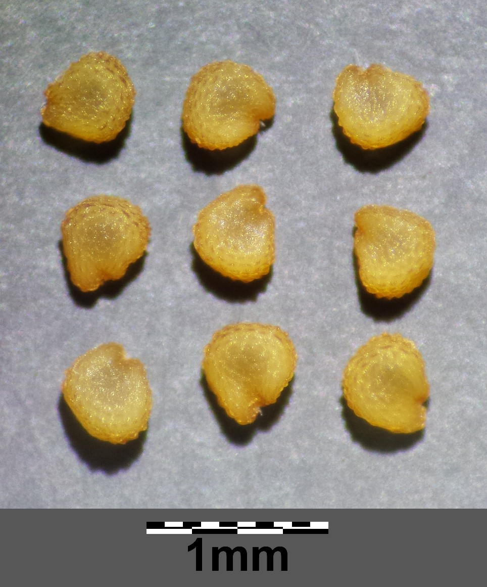Samen eiförmig, 0,45 - 0,55 mm lang, bräunlich, mit stumpfen Warzen