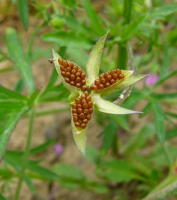 Samen eiförmig, mit kleinem Elaiosom (= Anhängsel für Ameisen)