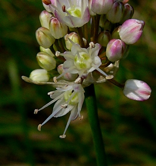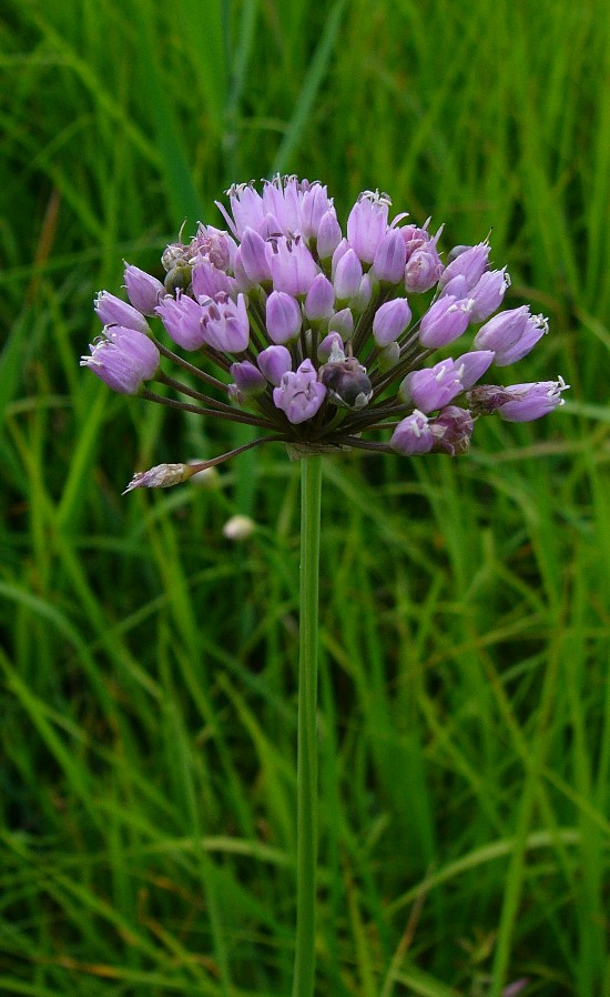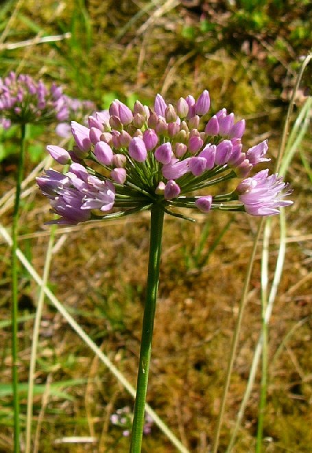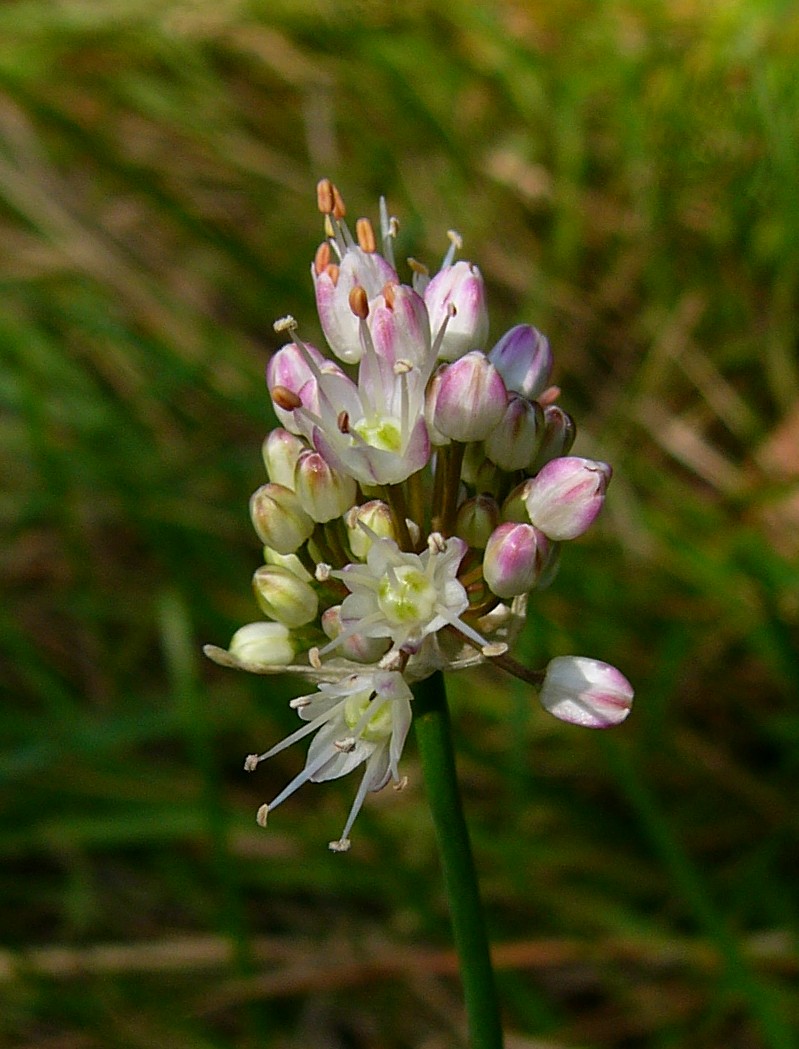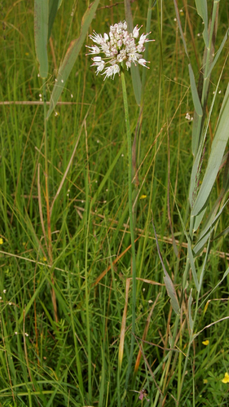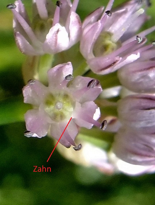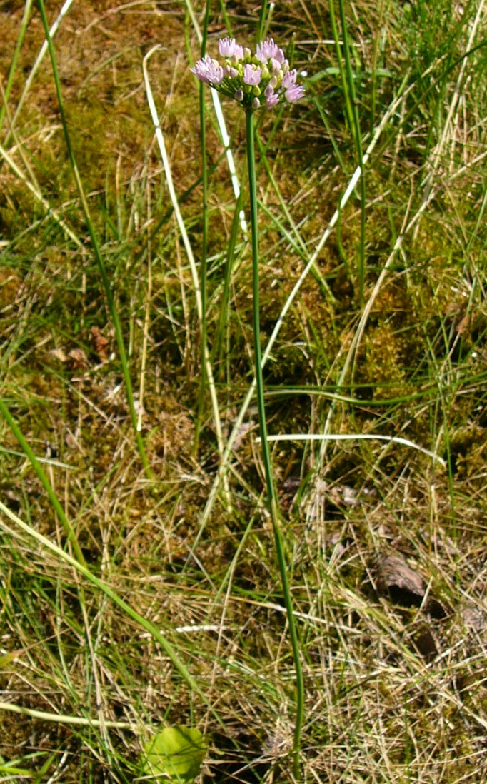 Blütenhüllblätter +/- gleich, kürzer als der Blütenstand Scheindolde fast kugelig, ohne Brutzwiebeln Blüten rosa bis weiß, Staubblätter deutlich länger als die Blüte Innere Staubblätter am Grund ohne Zähne Stängel rund, im unteren Drittel beblättert Blätter nur 1,5 mm breit, rinnig