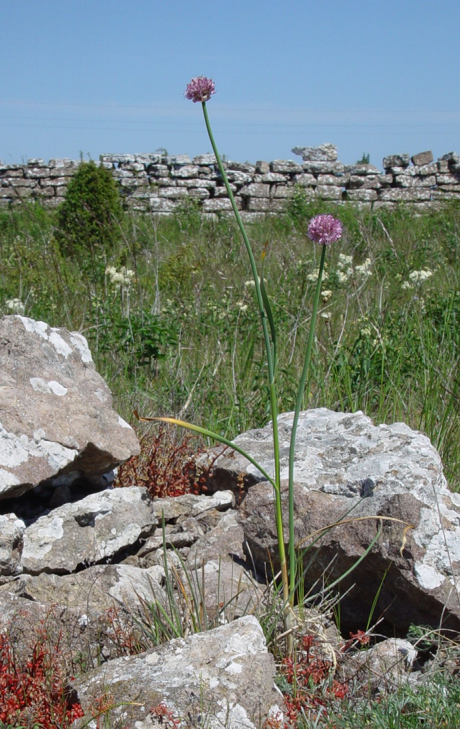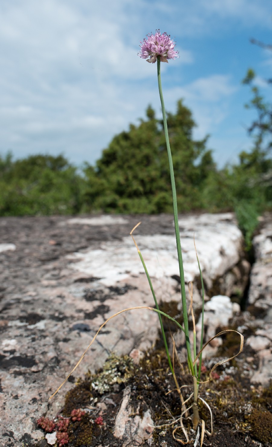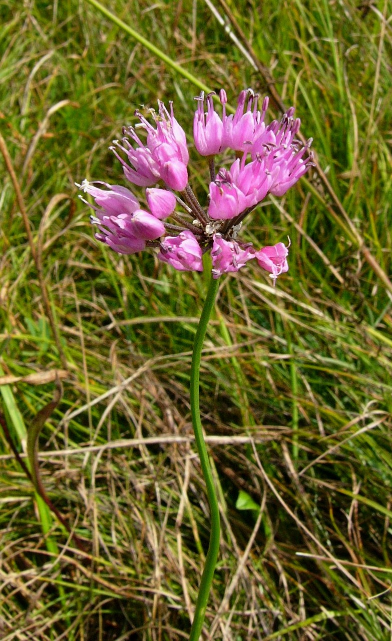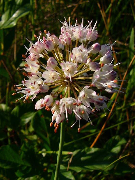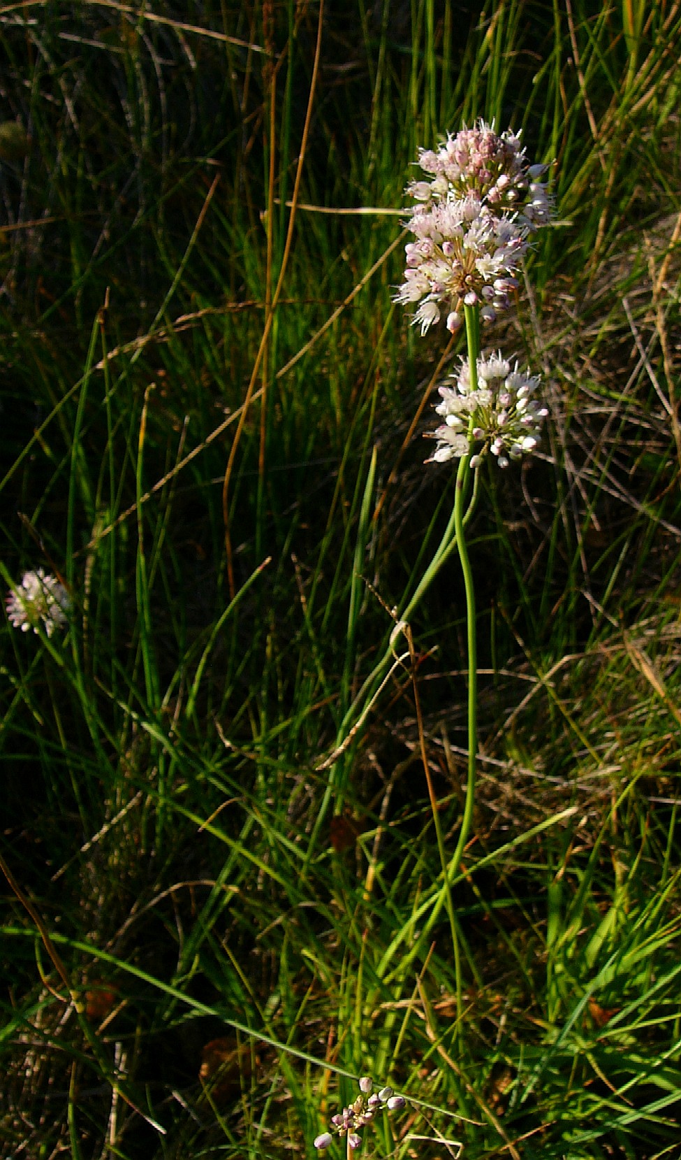 Blütenhüllblätter +/- gleich, kürzer als der Blütenstand Scheindolde fast kugelig, ohne Brutzwiebeln Blüten rosa bis weiß, Staubblätter deutlich länger als die Blüte Innere Staubblätter am Grund ohne Zähne Stängel rund, im unteren Drittel beblättert Blätter nur 1,5 mm breit, rinnig