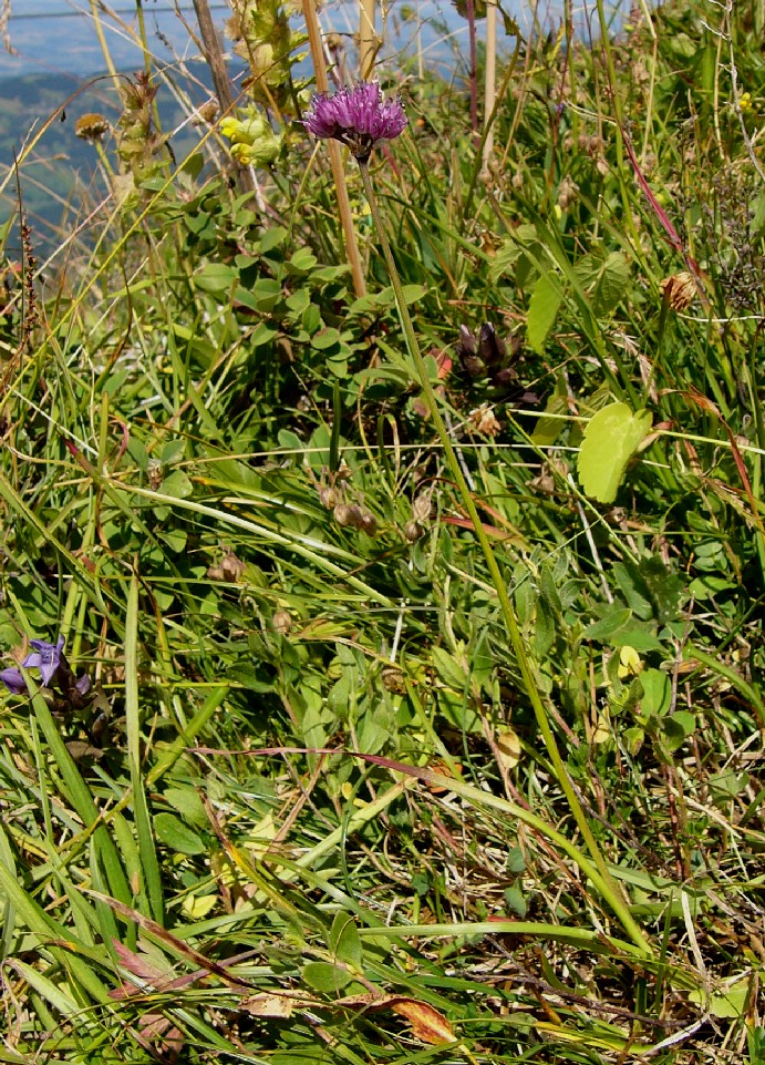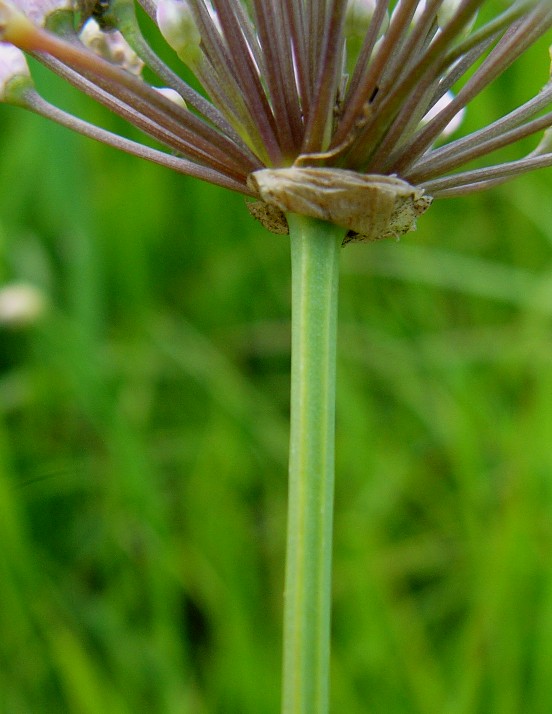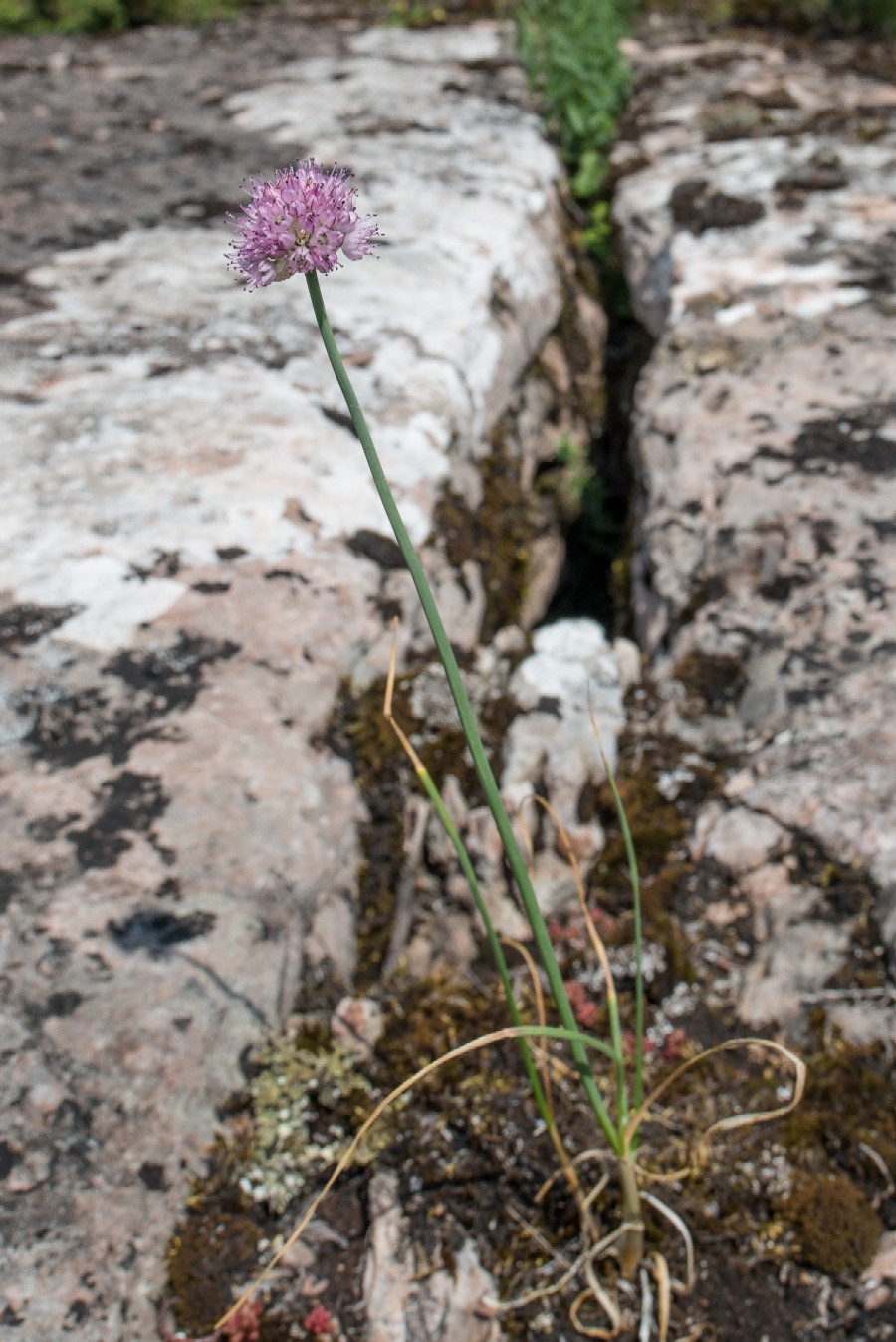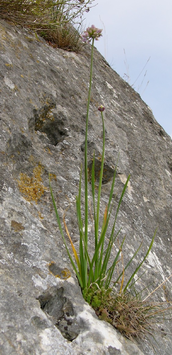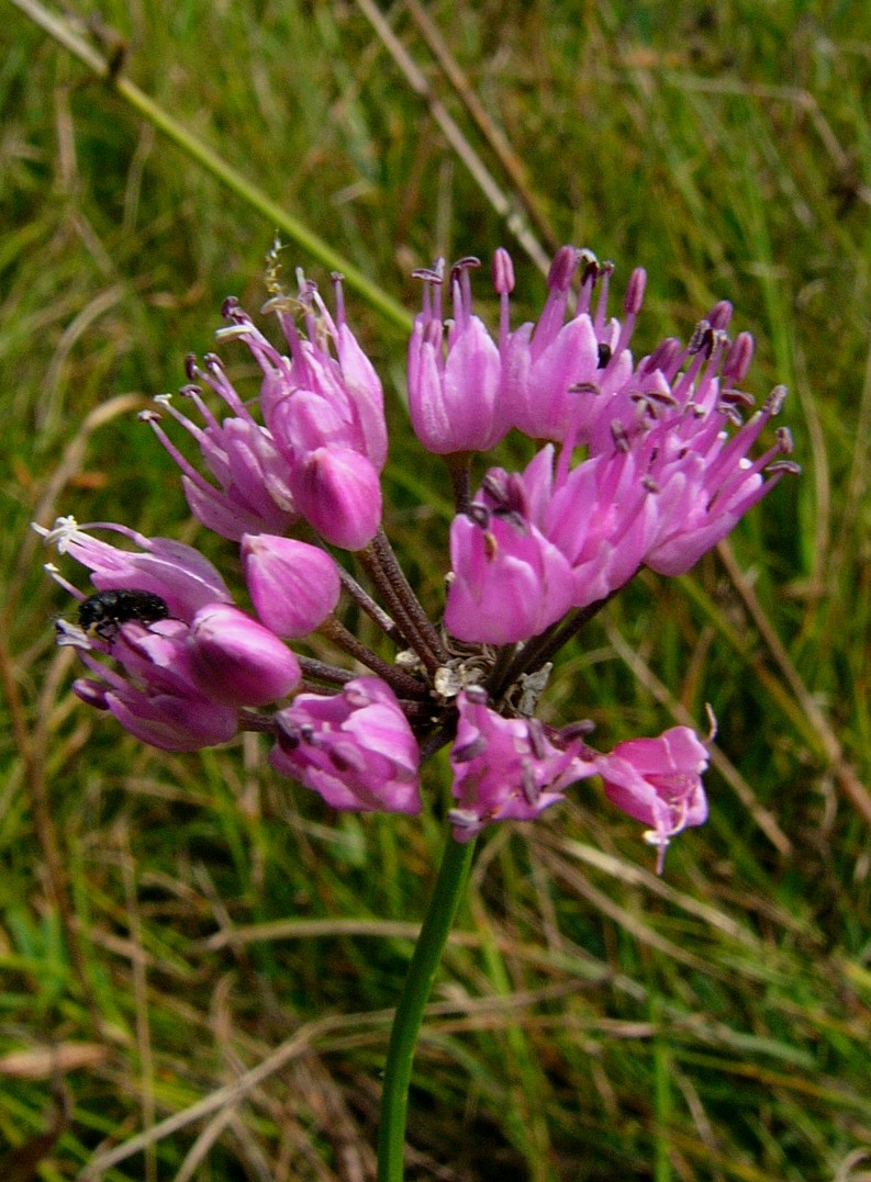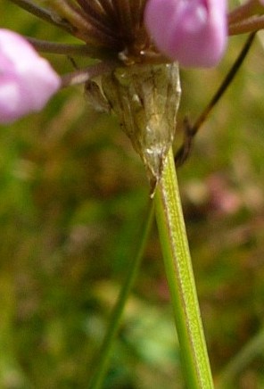 Blütenhüllblätter +/- gleich, kürzer als der Blütenstand Scheindolde fast kugelig, ohne Brutzwiebeln Blüten rosa bis weiß, Staubblätter deutlich länger als die Blüte Innere Staubblätter am Grund ohne Zähne Stängel rund, im unteren Drittel beblättert Blätter nur 1,5 mm breit, rinnig