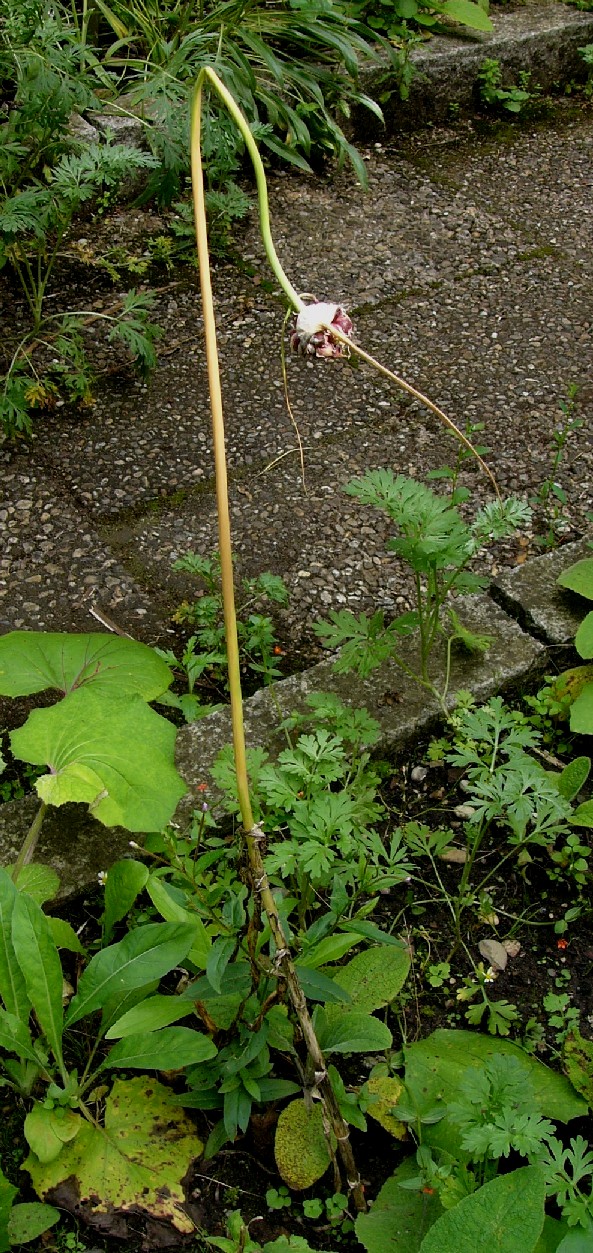 Pflanze 60 - 100 cm groß Stängel vor dem Blühen schlangenartig eingerollt Zwiebel mit rundlich-eiförmigen, bis fast kugelförmigen Nebenzwiebeln (Zehen)