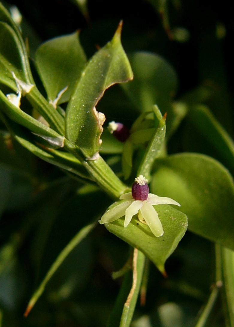 Immergrüne Halbsträucher Blüten und Früchte werden direkt auf den "Blättern" (= Phyllokladien) gebildet > 1 |