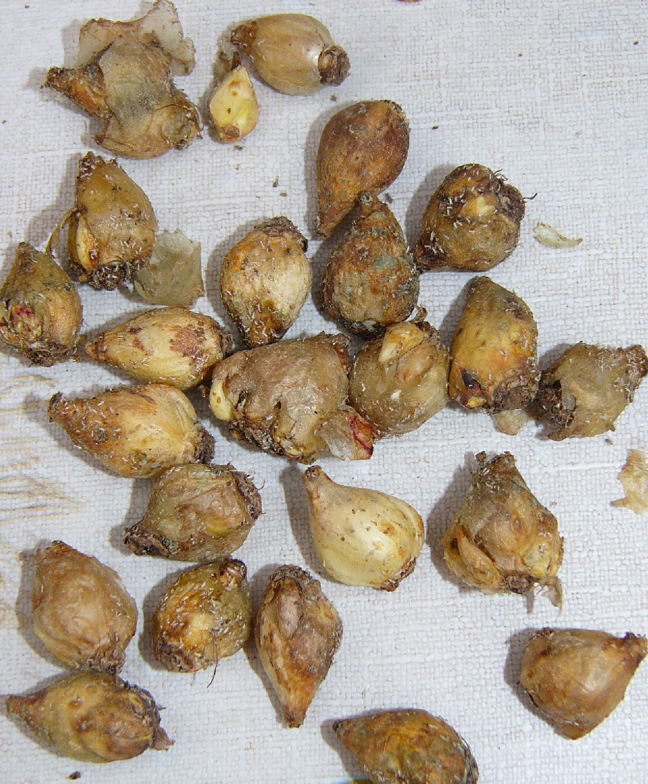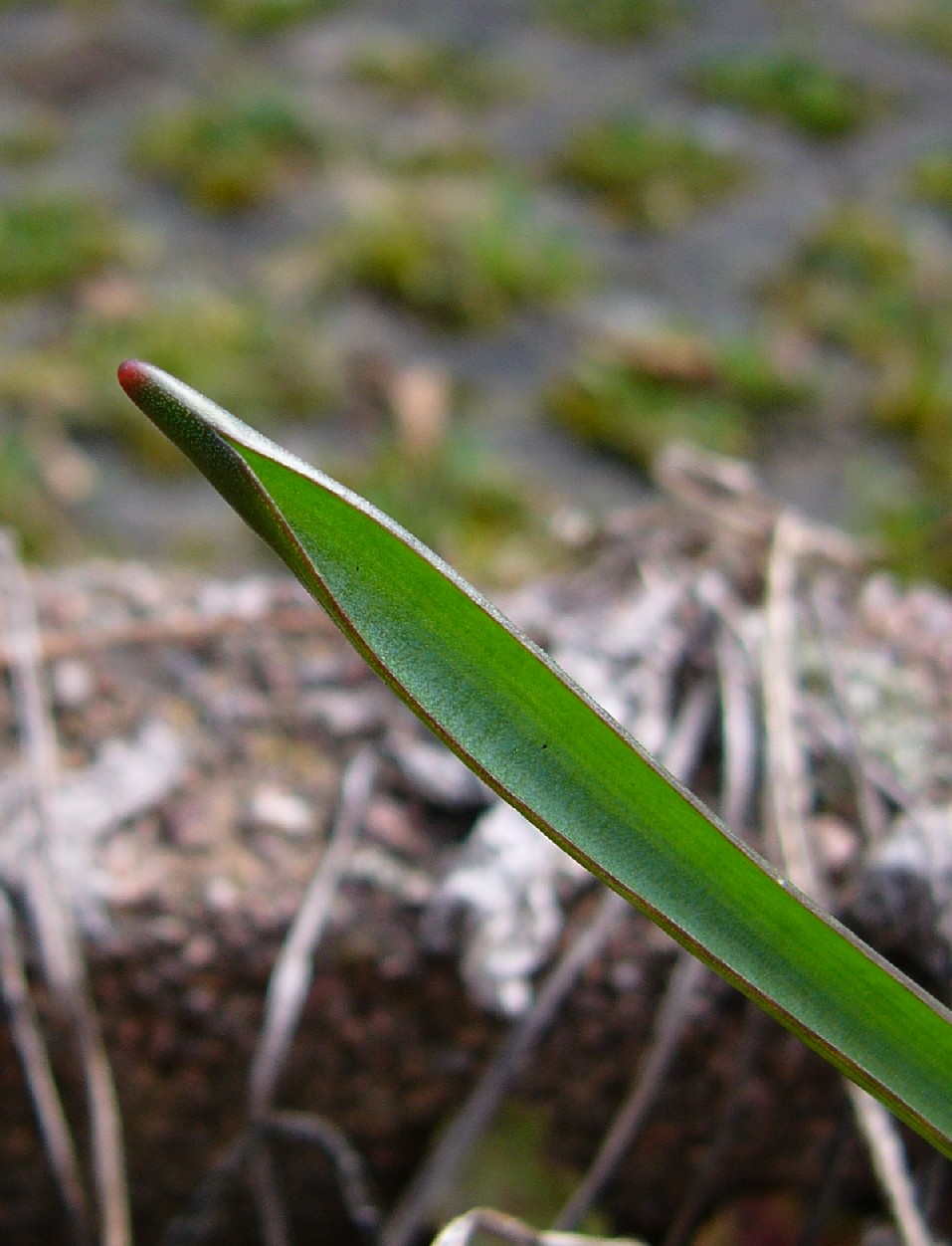 8 mm breit, rinnig, dunkelgrün Blätter mit Kapuzenspitze, Rand der Blätter oft rot überlaufen Zwiebeln klebrig, ca. 20 mm lang, 10 mm breit