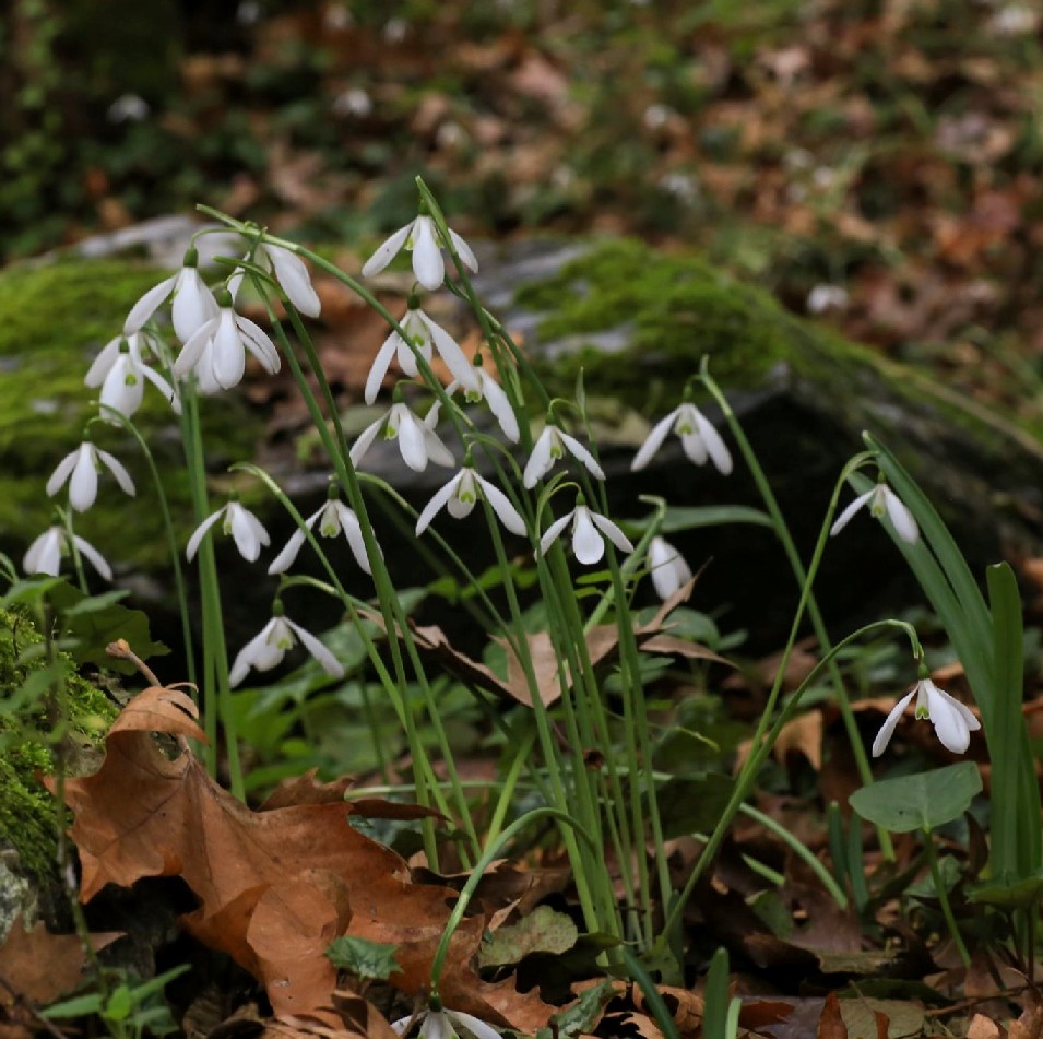 Blüten nickend, mit 6 Perigonblättern, äußere Perigonblätter lanzettlich, meist rein weiß, vorne stumpf, innere Perigonblätter viel kürzer, ausgerandet, mit grünen Flecken