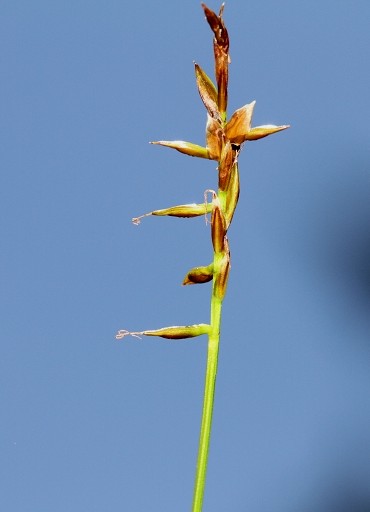 Achsenfortsatz des weiblichen Teilblütenstandes ca. 1 - 2 mm aus dem Schlauch herausragend.     Stängel rundlich oder stumpf dreikantig, glatt,