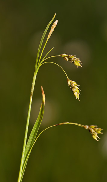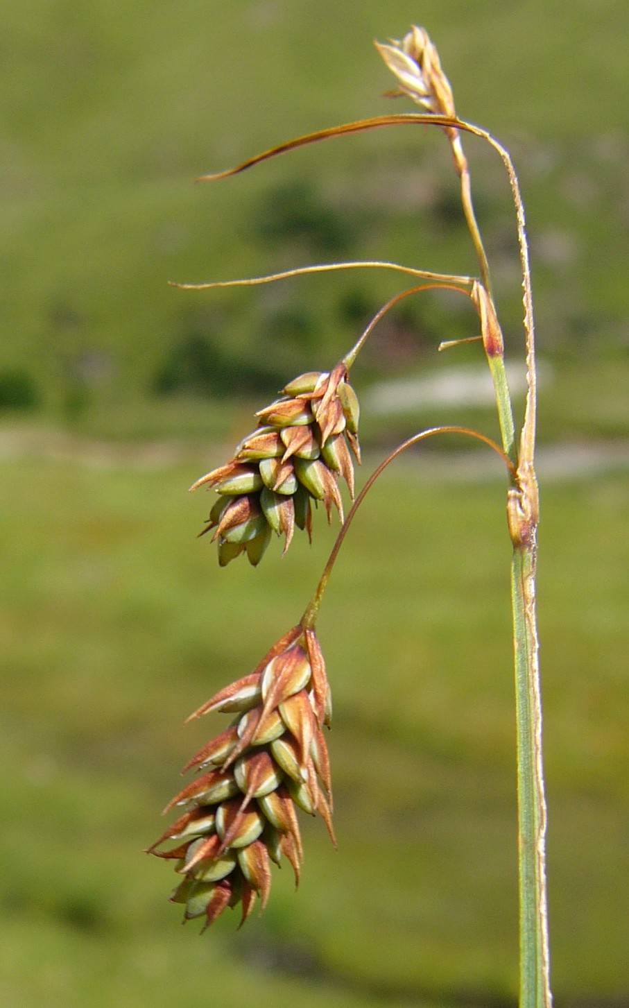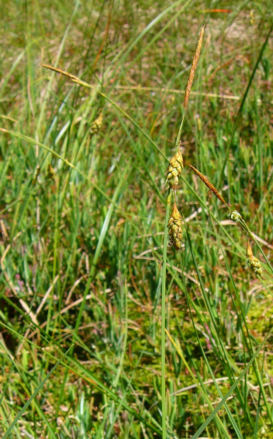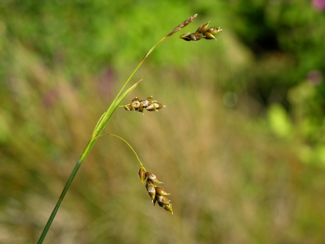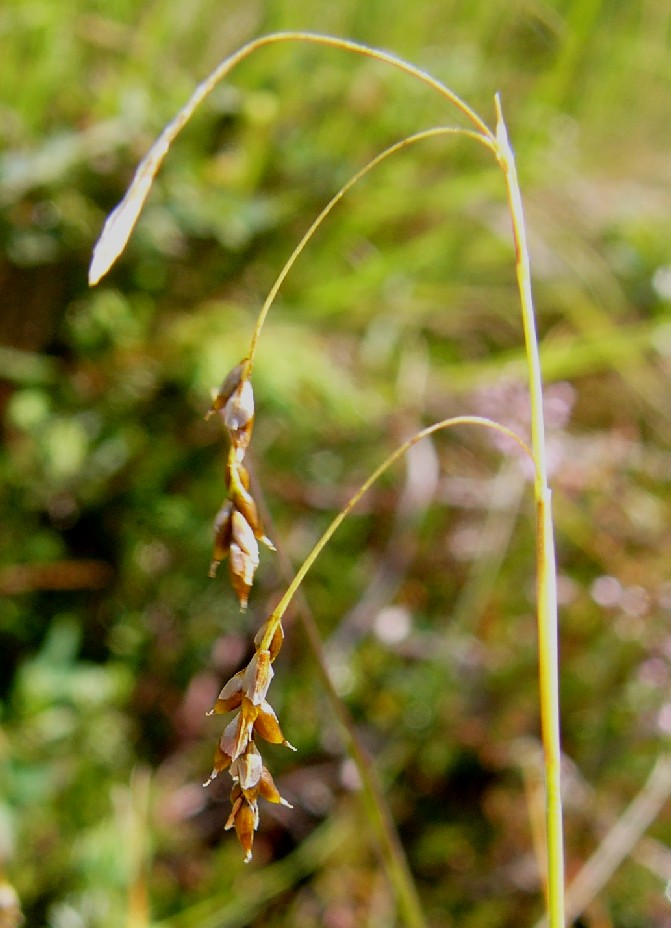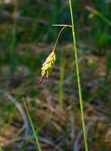 Weibliche Ähren mit 6 - 8 Blüten, lang gestielt, deswegen Schläuche elliptisch, 2 - 3,5 mm lang, 3 Narben Spelzen braun, häutig, kürzer als die Schläuche Blätter