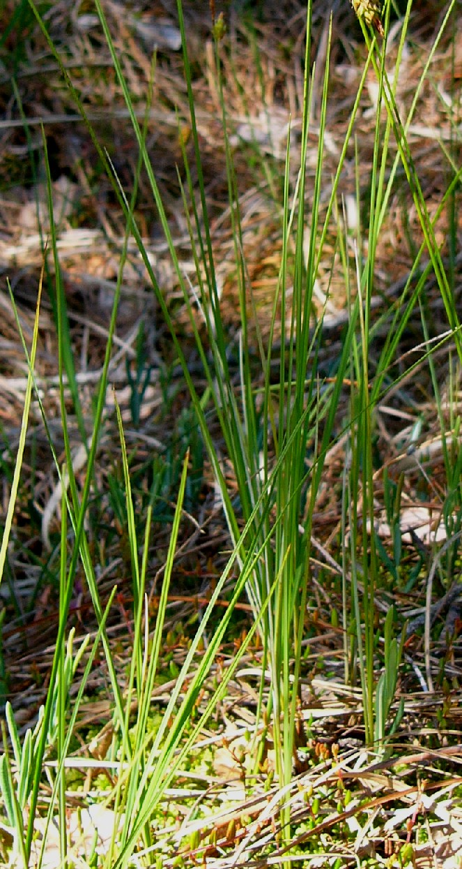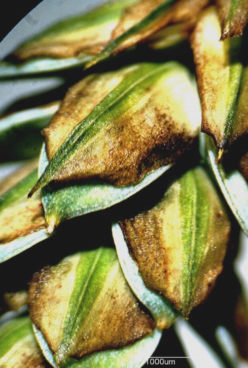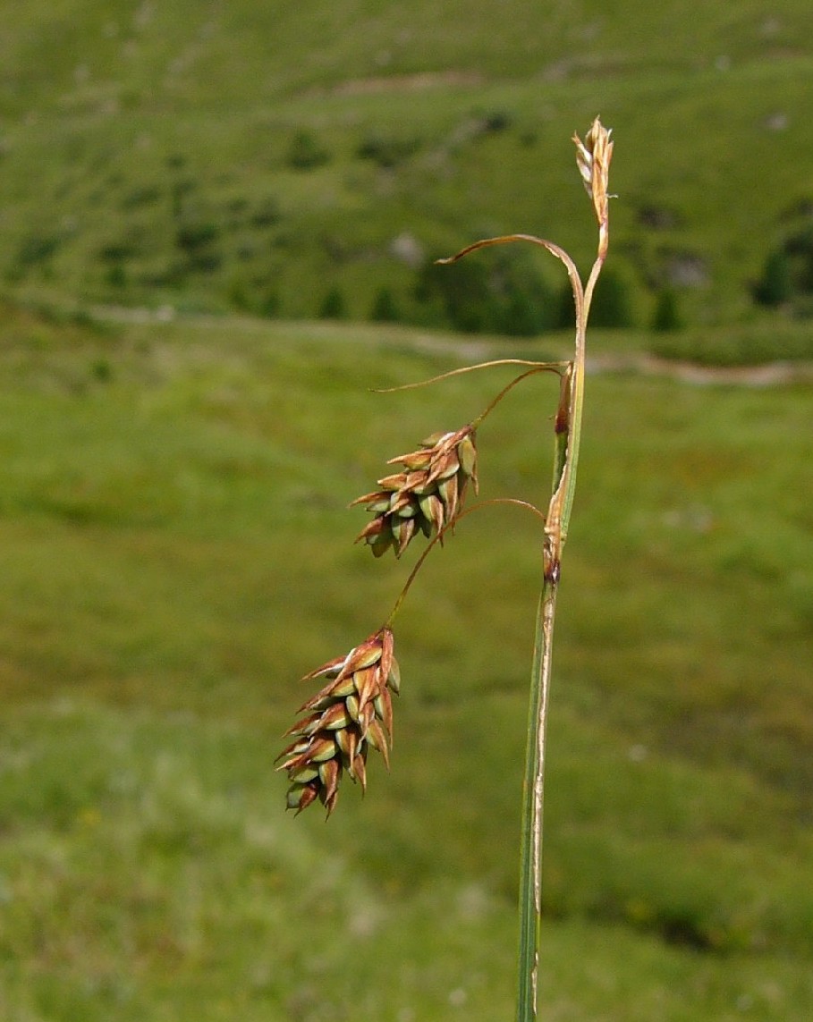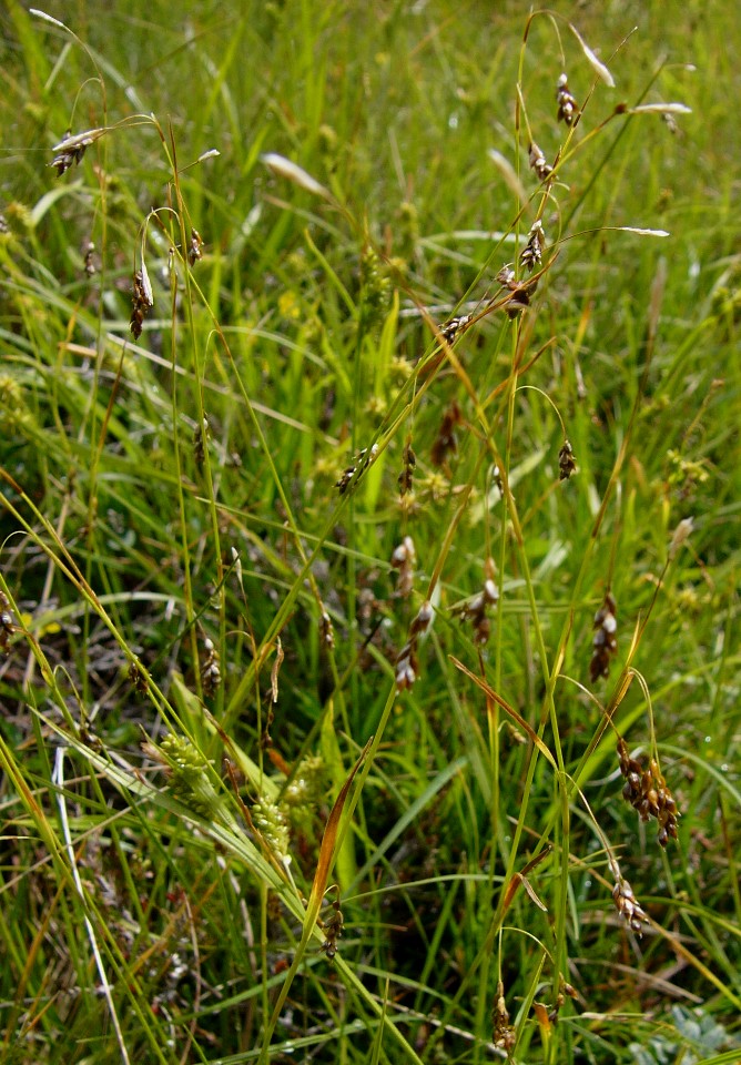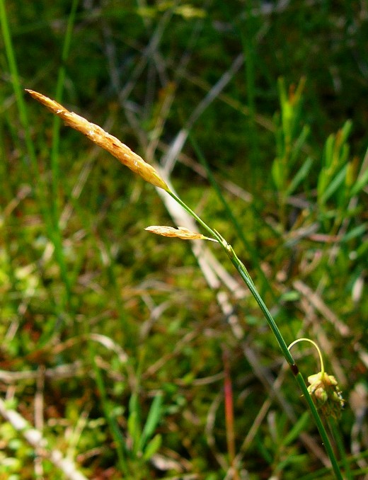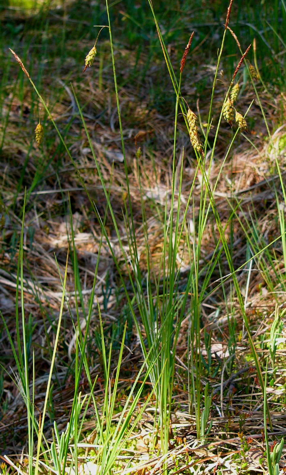 Weibliche Ähren mit 6 - 8 Blüten, lang gestielt, deswegen Schläuche elliptisch, 2 - 3,5 mm lang, 3 Narben Spelzen braun, häutig, kürzer als die Schläuche Blätter