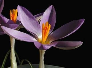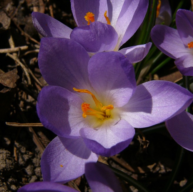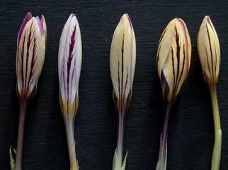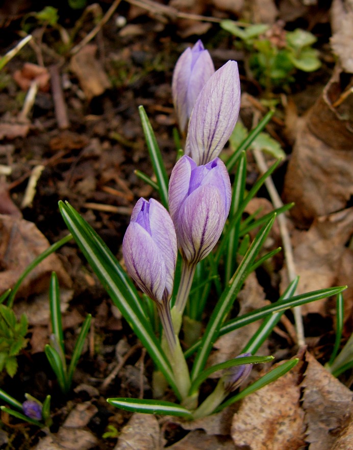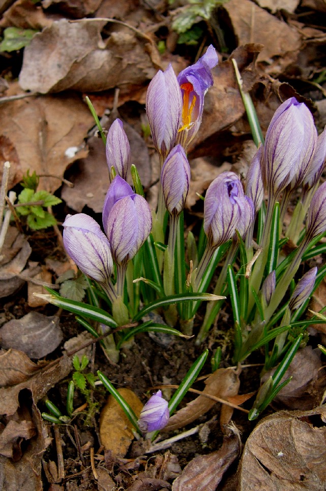 Weiße/Violette im Frühjahr blühende Krokusse mit gelbem Perigonschlund, außen mit deutlichen dunklen Streifen
