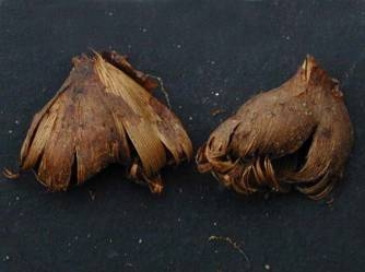heller als die inneren, oft gelblich, mit dunkelvioletter Zeichnung Knollenhülle parallelfaserig > 5