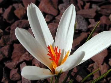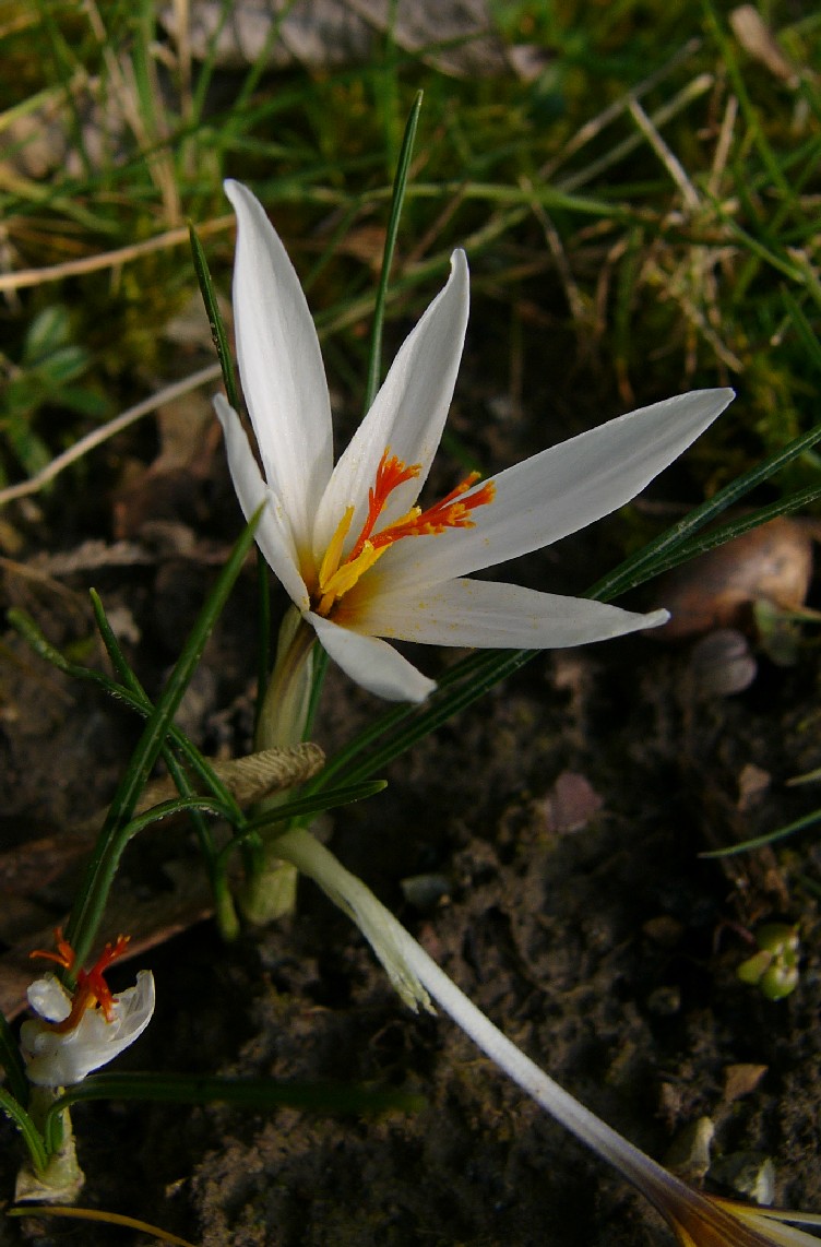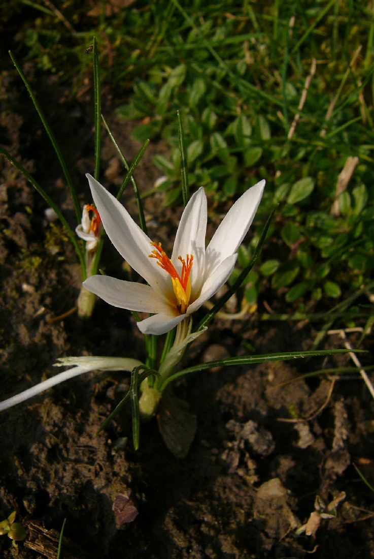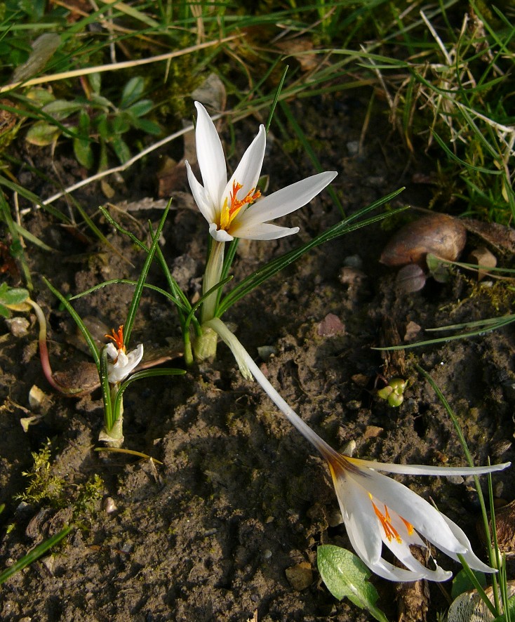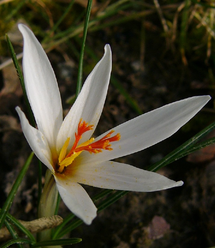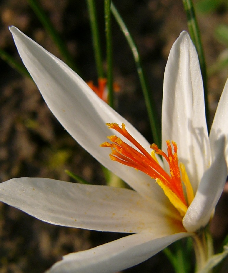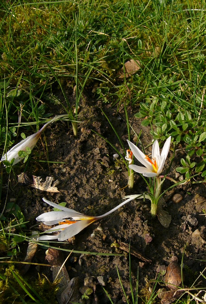 Blüten weiß, oft teilweise violett oder mit violetten Streifen, Perigonblätter schmal, spitz, Schlund gelb