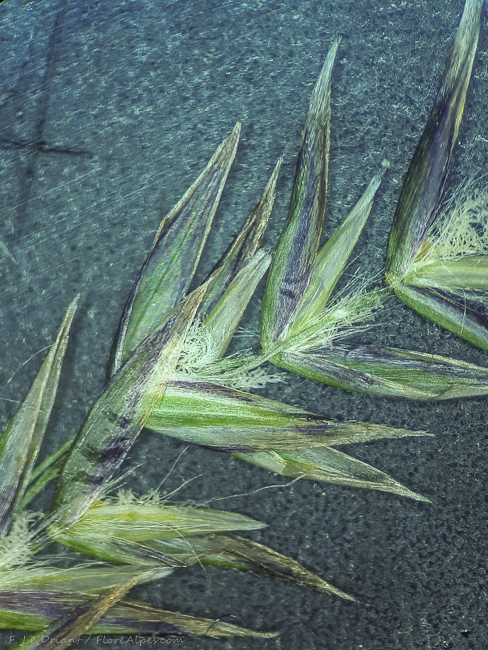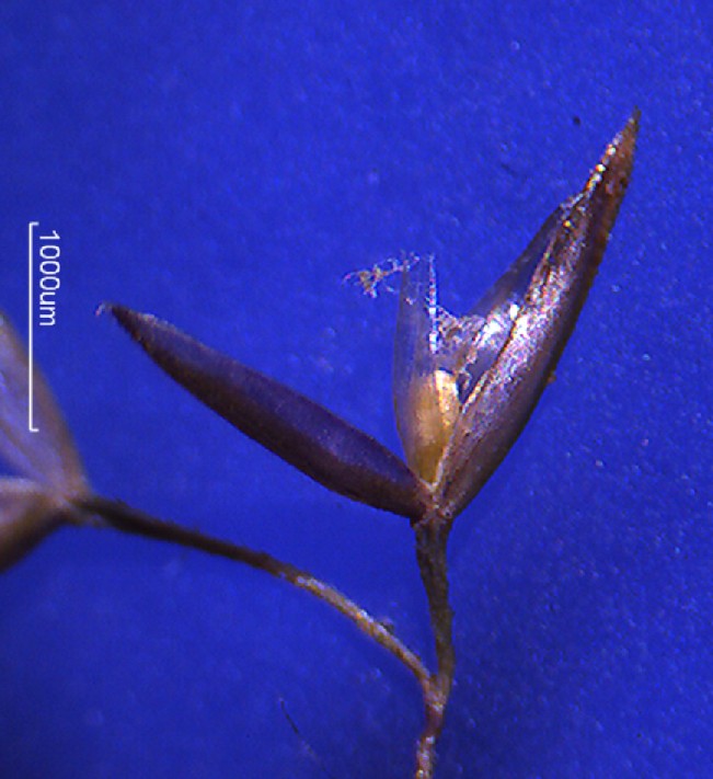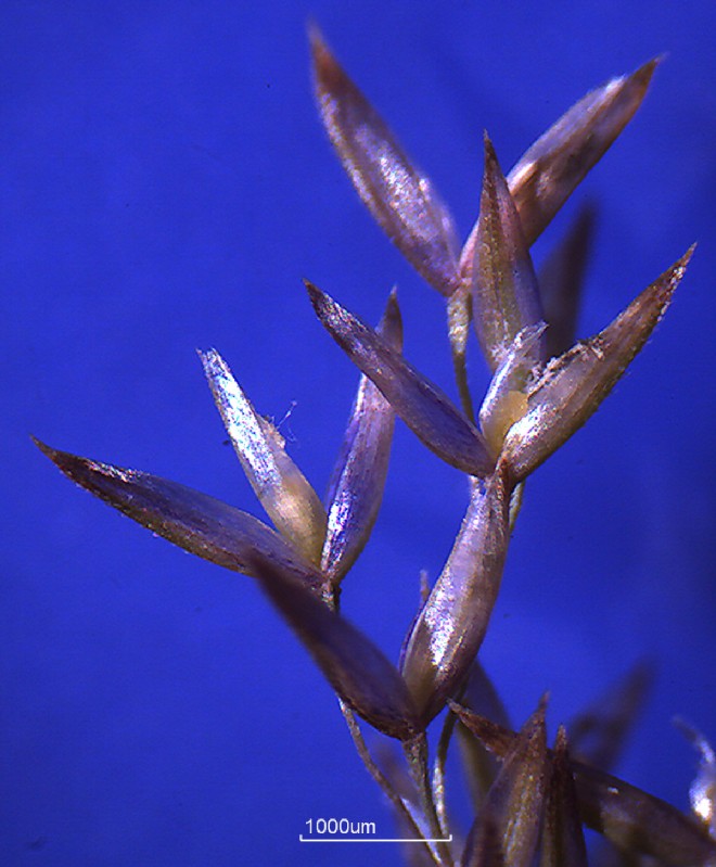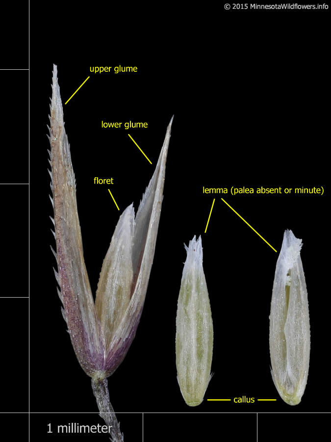 Hüllspelzen (glume) etwas ungleich, auf dem Kiel sehr rau, Deckspelze (lemma) oben gezähnelt, kürzer als die Hüllspelzen, meist unbegrannt, Kallus mit wenigen Härchen