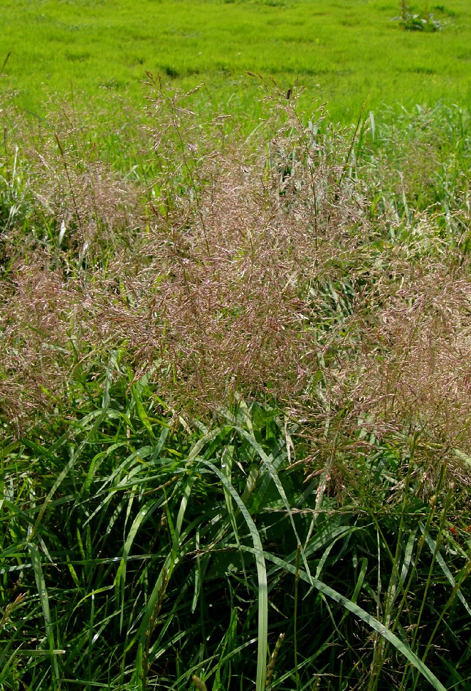 Seltener Neophyt Blattspreiten oberseits sehr rau Rispe oft länger als die halbe Halmlänge, Ährchen nur im obersten Drittel der langen Rispenäste angeordnet > 5