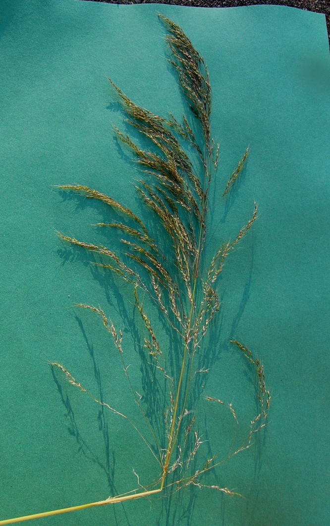 Pflanze 60 - 120 cm groß Rispe 20 - 30 cm lang, vielblütig, stark verzweigt Ährchen 7 - 9 mm lang, 1- blütig, gelblich- glänzend Deckspelze kürzer als die Hüllspelze undeutlich 5- nervig, oberwärts dicht behaart Blattspreiten bis 60 cm lang, 4 - 7 mm breit, flach, am Ende borstlich rau, Ligula 0,5 - 7 mm lang, häutig Blattscheiden bis zum Grund offen, gerieft, durch auffallende Linie von Spreite abgesetzt