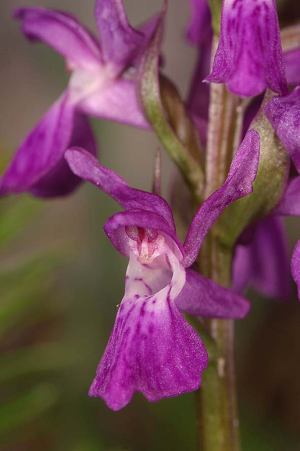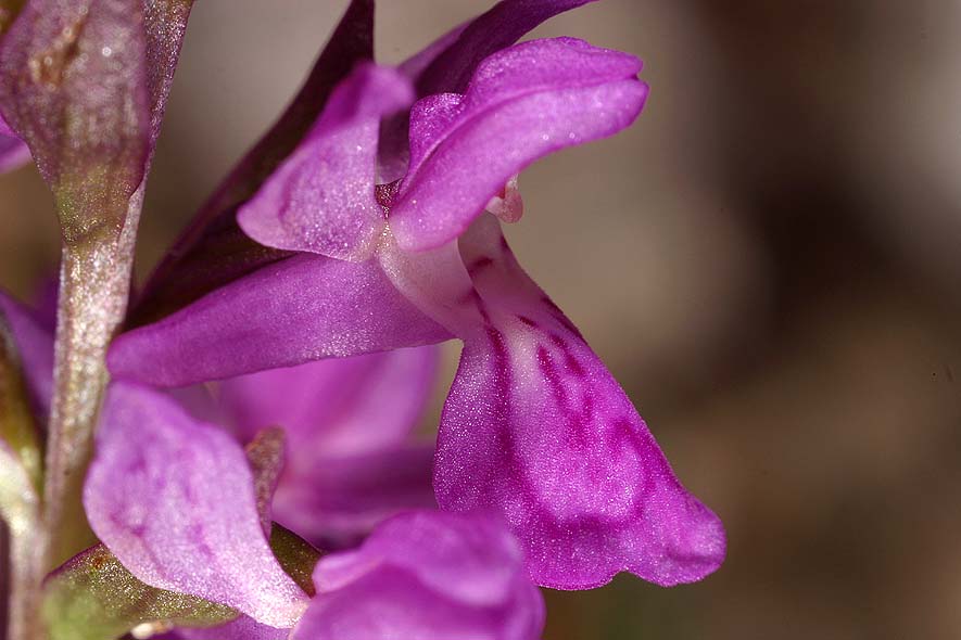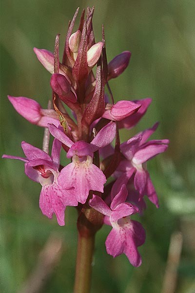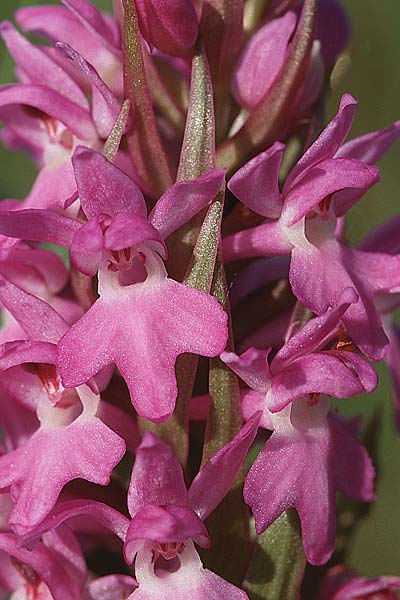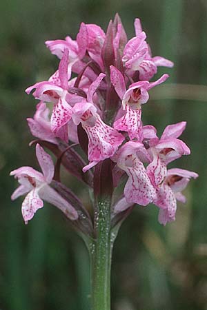 Blüten rosaviolett, überwiegend ungezeichnet, Lippe deutlich 3- teilig, bis 13 mm lang und 10 mm breit, Seitenlappen etwas abwärts gebogen, etwa so groß wie der Mittellappen
