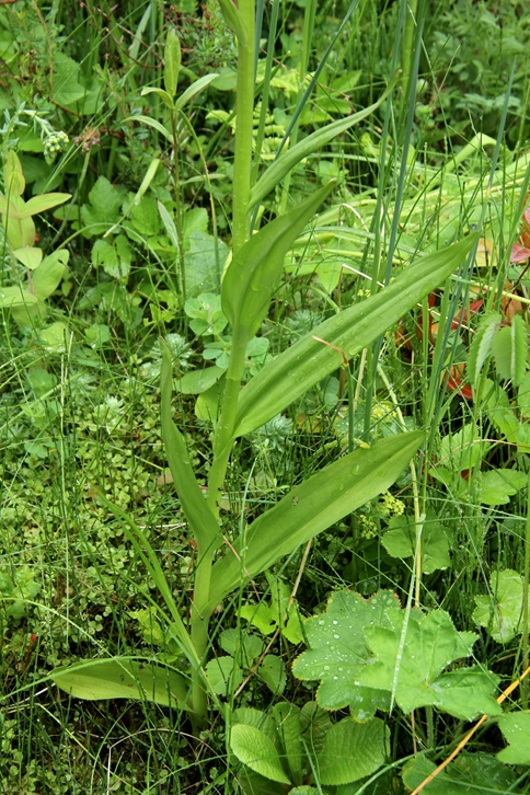 5 - 8 grüne Blätter, aufrecht abstehend, ohne Kapuzenspitze, das größte 7 - 14 mal so lang wie breit, Blätter ungefleckt