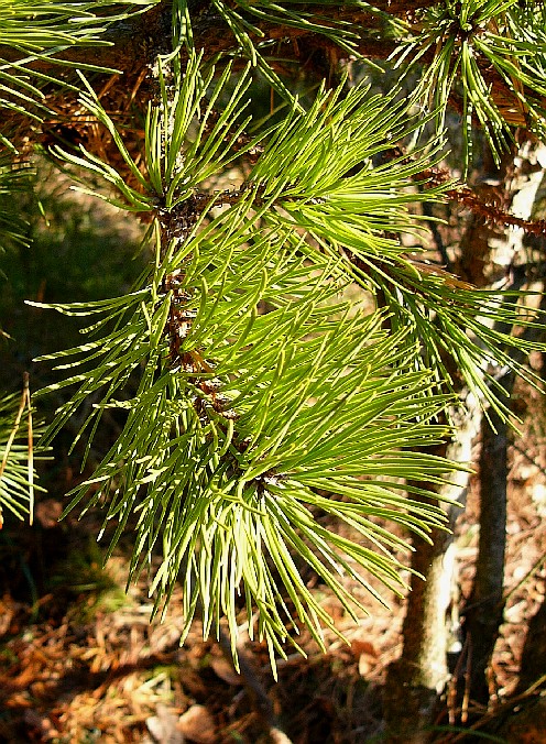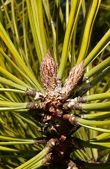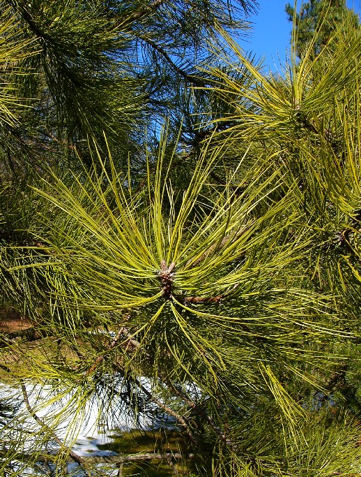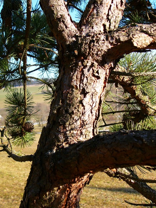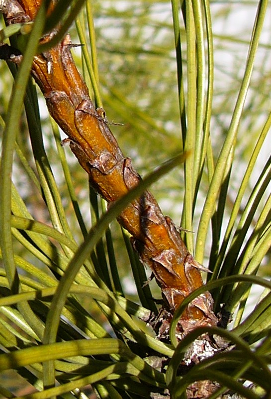 Nadeln an den Zweigenden schopfig gehäuft Nadeln zu 3, 8- 10 cm lang, jung hellgrün Borke dunkel rotbraun, tief rissig