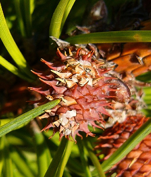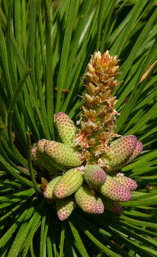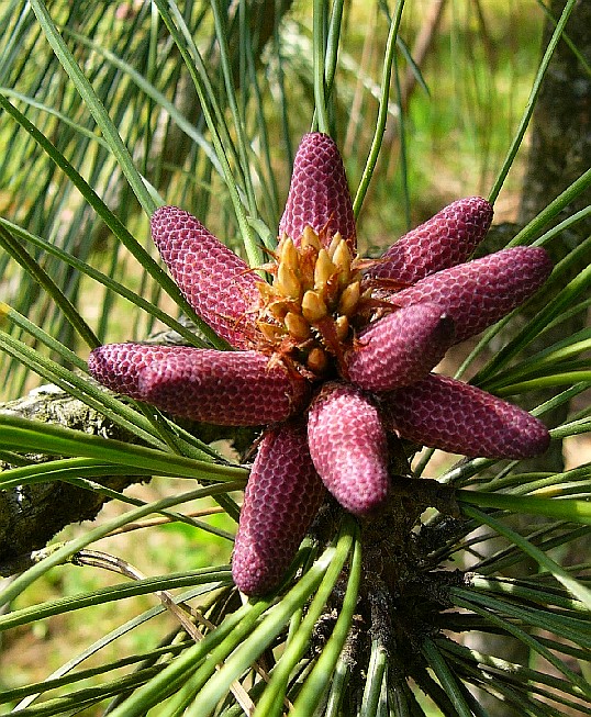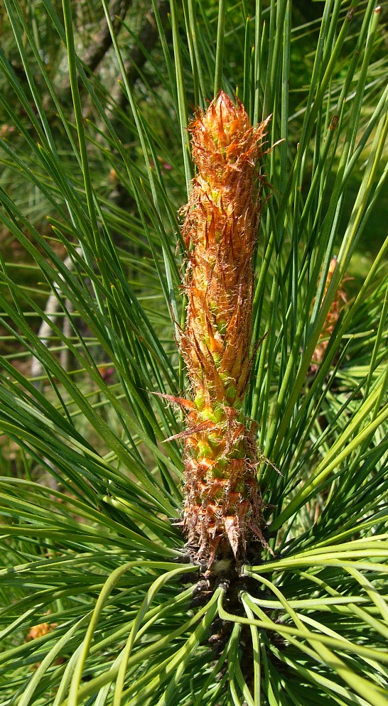 , Männliche Blüten länglich, rot Knospe wenig oder nicht harzend Maitriebe sehr kräftig Reife Zapfen 7 - 10 cm groß Junge Zweige glänzend rotbraun Nadeln an den Zweigenden schopfig gehäuft Nadeln zu 2 - 5, bis 25 cm lang Borke rissig, rotbraun