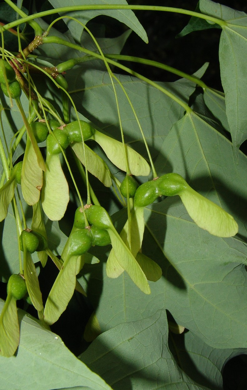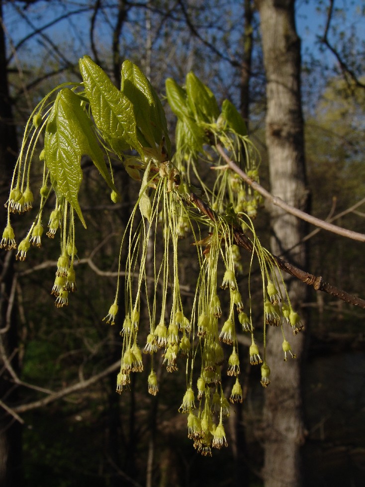 mit dem Laubaustrieb Fruchtflügel stumpfwinklig Mittlerer Blattlappen meist mit 4 Sekundärlappen > 4
