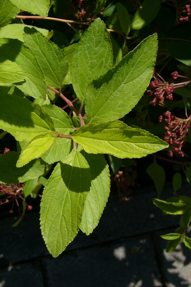 Blüten reinweiß, in vielblütigen Rispen Blätter bis 8 cm lang, länglich- eiförmig, gesägt bis ganzrandig