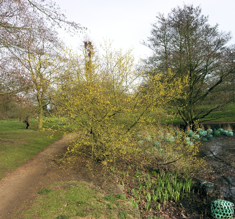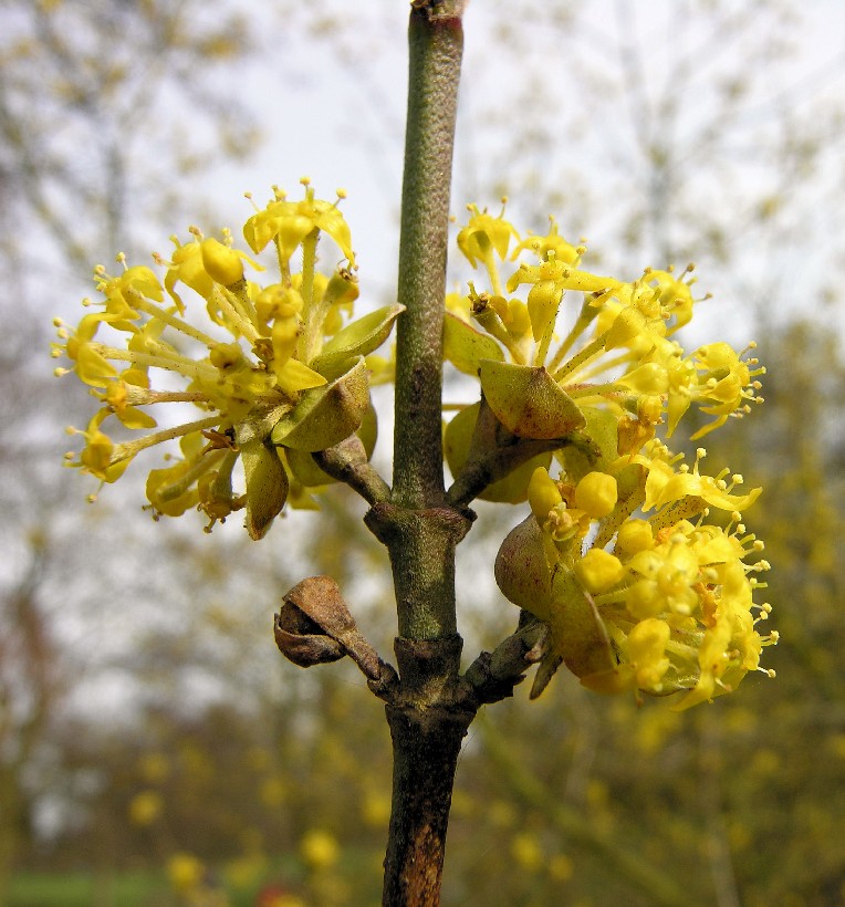 Sträucher oder kleine Bäume (bis 6 m) Blüten vor den Blättern erscheinend Blüten in Dolden, die entfalteten Knosenschuppen bleibend Blüten lang gestielt, mit 4 goldgelben, zurückgeschlagenen